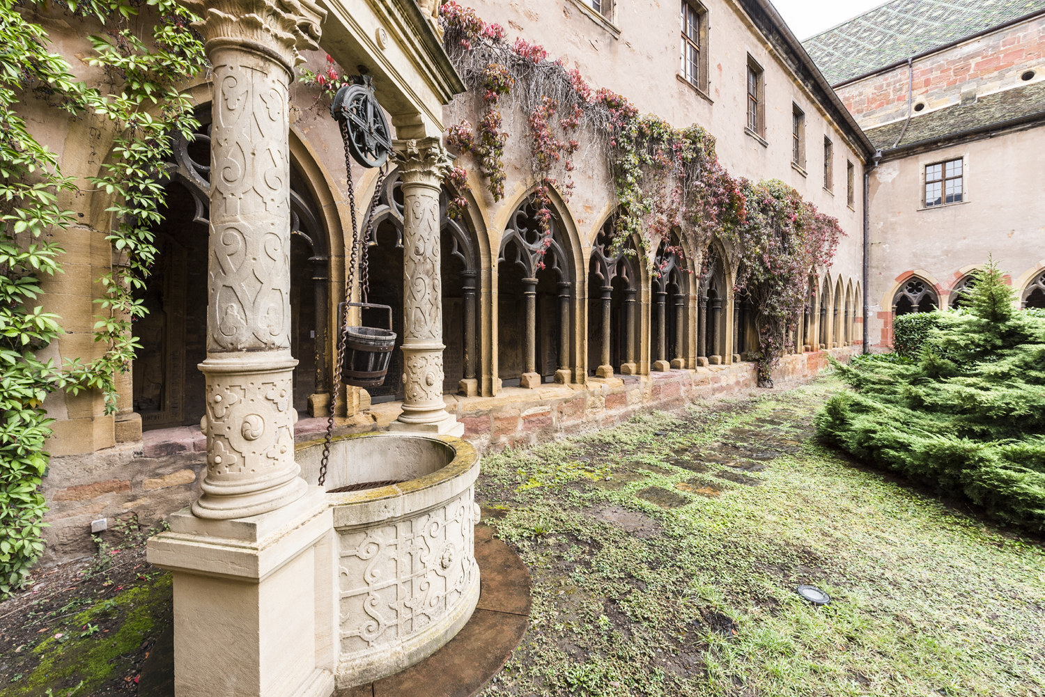 Until 1958, a fountain designed by Bartholdi stood in the middle of the cloister garden of the Unterlinden Museum in Colmar. It was topped by a statue of the painter Martin Schongauer. The fountain was later moved to the city and Schongauer’s statue was installed in a gallery of the cloister. In the western gallery, the oldest, a large washbasin is located opposite the winter refectory. From the Revolution to the middle of the 19th century, the convent was used as a military garrison. The stone of the washbasin still shows traces of wear due to the officers who used it to sharpen their sabres. Since 2017, the well of the tailors’ guild has occupied the north-east corner of the garden.
