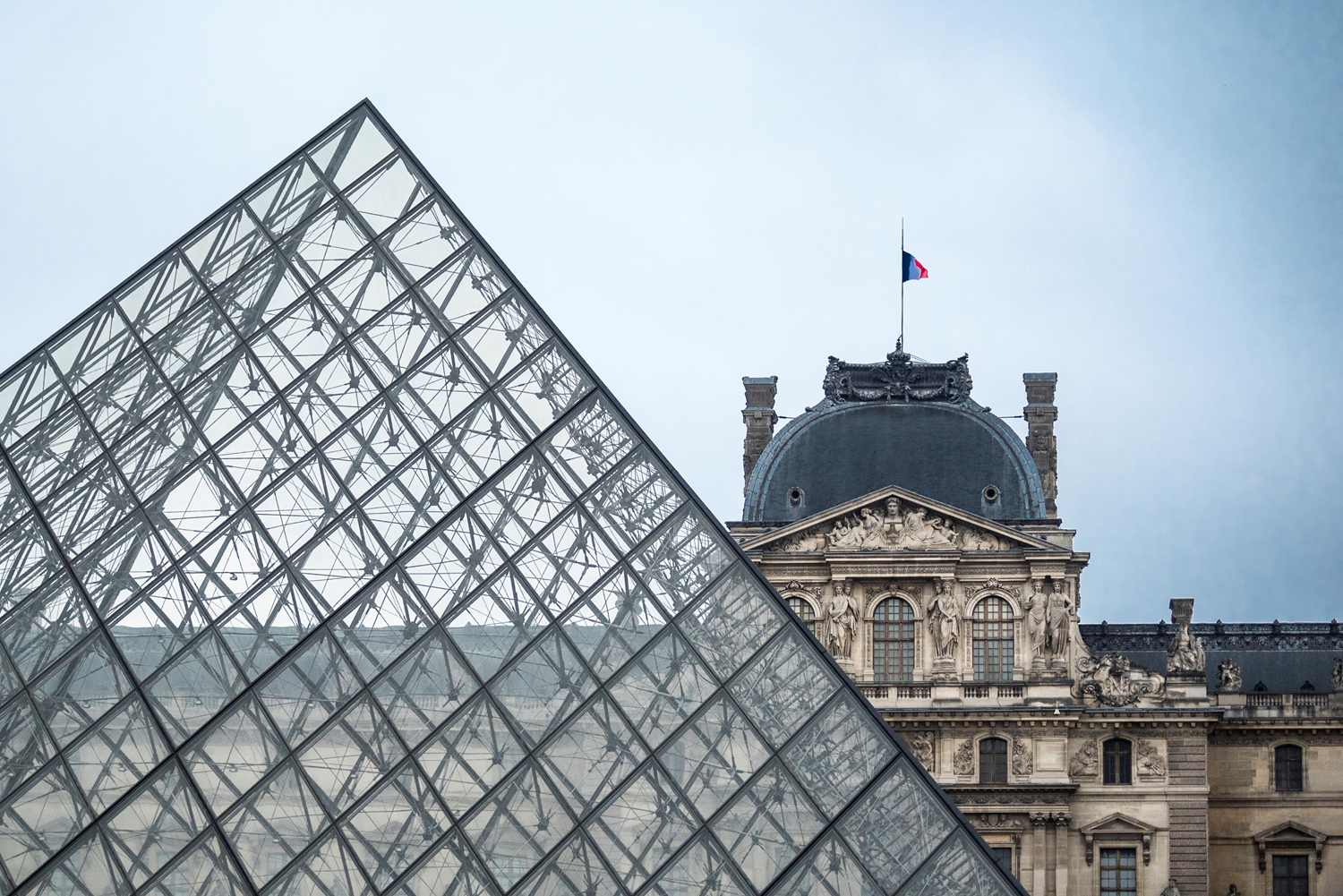 The Sully Pavilion provides access to the large Cour Carrée of the Louvre. Initiated by François I and completed under Louis XIV, the buildings surrounding this courtyard are located on the grounds of the former medieval fortress of Philippe Auguste. The triangular pediment of the pavilion is decorated with a portrait of Napoleon I towering over the muses of history and the arts (by Antoine-Louis Barye and Pierre-Charles Simart). Six caryatids (by Simart and Francisque Duret) support it and two corner statues represent Art and Encouragement (Lebœuf-Nanteuil). The building is the only pavilion in the Louvre to have a clock and to carry the French flag.