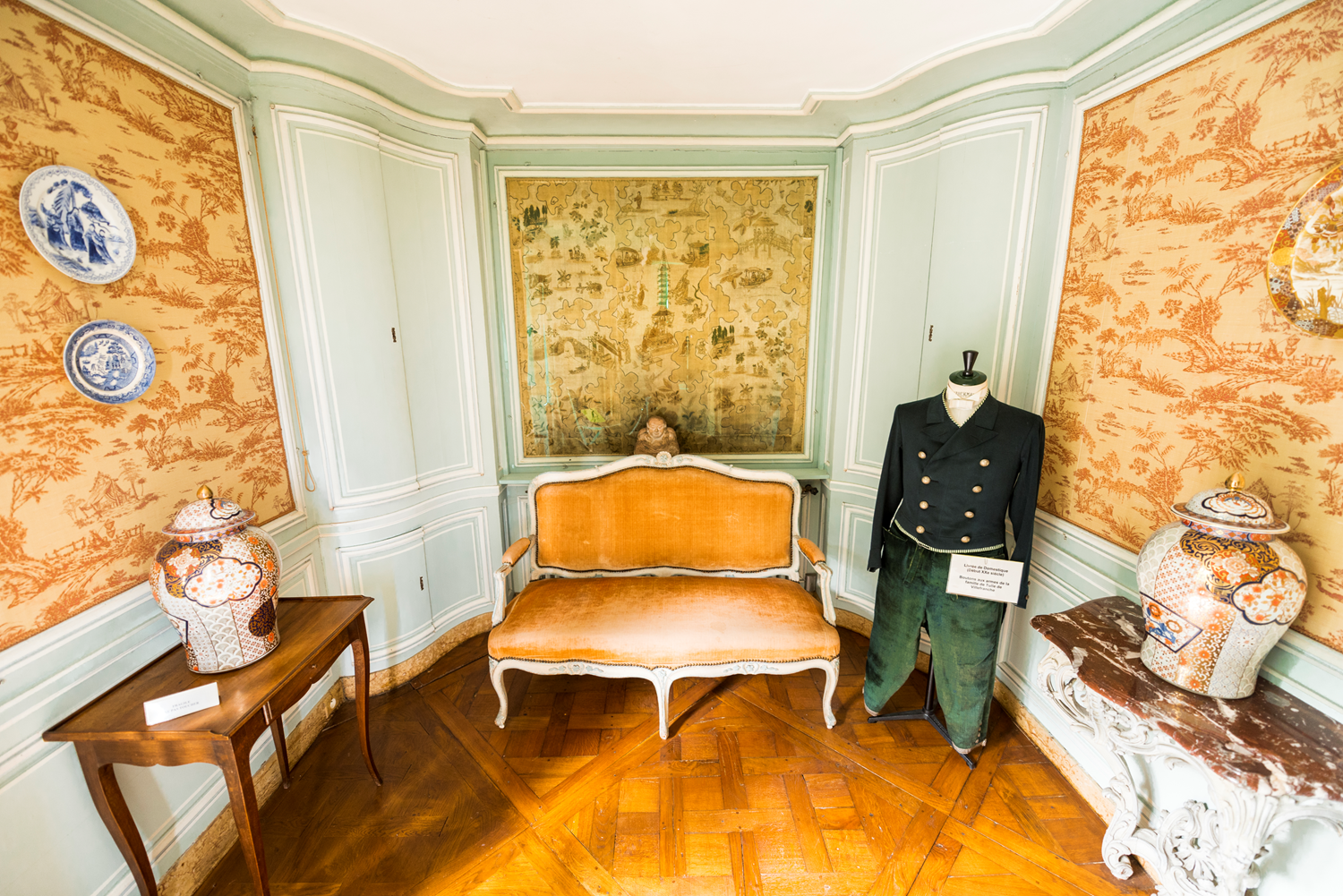 After the death of Louis XIV, the pompous style imposed by the king on the court on the rich residences was abandoned. Numerous private mansions were built under Louis XV, such as the Château du Haut in Villarceaux. A certain comfort prevailed over pomp and rooms became more intimate. This was the era of the boudoir. Harmony was sought, as in this small boudoir with windows overlooking the garden. The Chinese-inspired wall hangings highlight the plates and vases. At this time, the French East India Company imported numerous Chinese and Japanese porcelains from Asia.