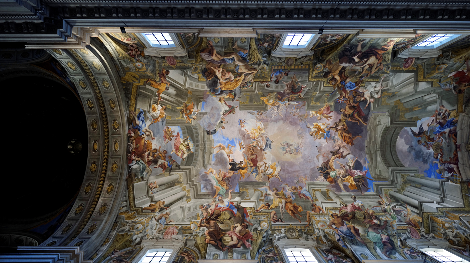 Le plafond de l’église Sant’Ignazio di Loyola a Campo Marzio avec l’immense fresque en trompe-l’œil (anamorphose) de 16m de large sur 26m de long peinte par le père jésuite Andrea Pozzo de 1684 à 1694. Sur la gauche, on remarque aussi la coupole en trompe-l’œil qui n’a pas pu être construite suite à l’opposition des riverains, et le manque de budget.