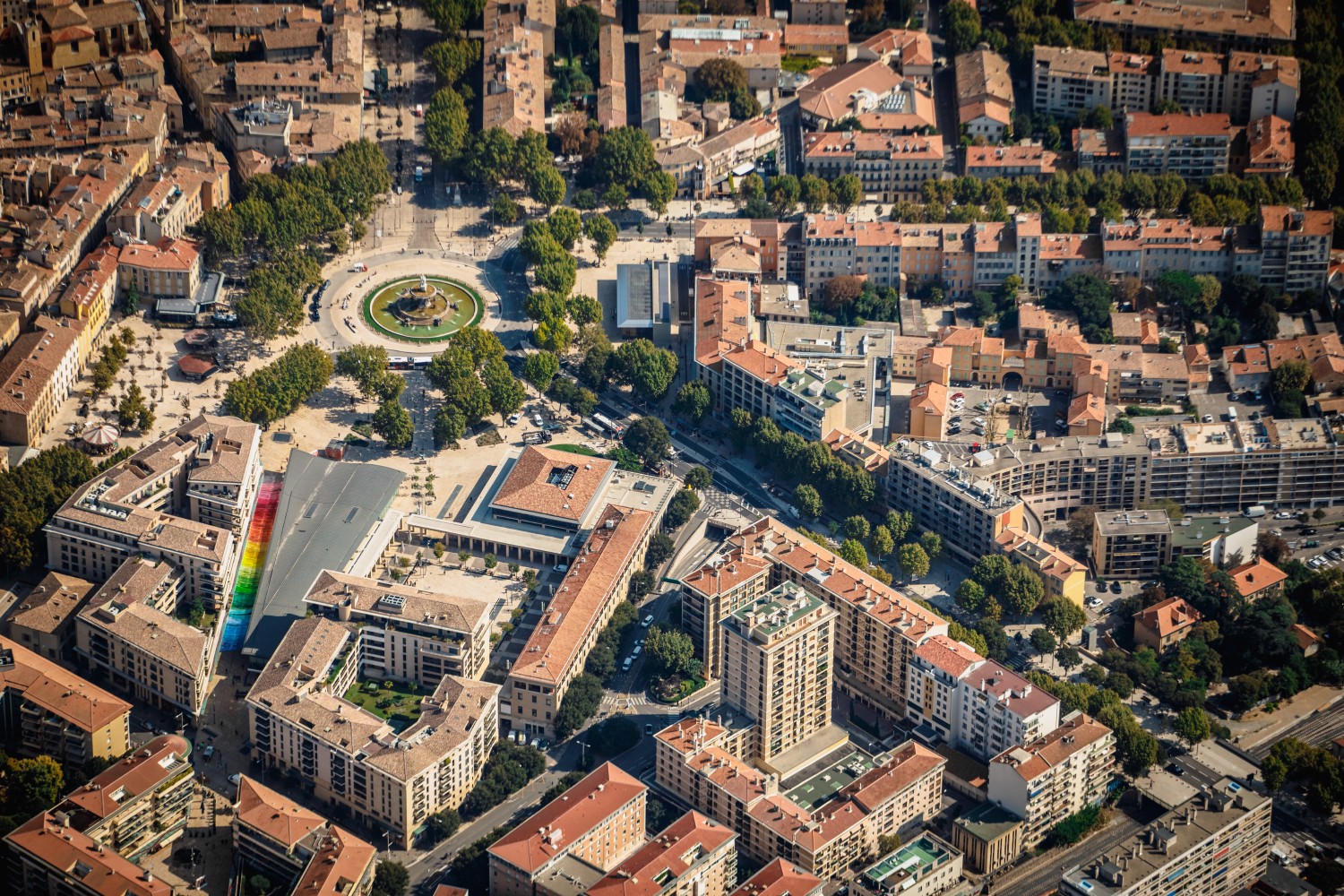 In 1989, an international urban economy competition was launched by the municipality of Aix-en-Provence for the redevelopment project of the wasteland located southwest of the Rotonde and the Cours Mirabeau. In June 1990, the choice settled on the project of the Catalan town planner Oriol Bohigas who imagined a place of animation combining habitats, shops, offices, and public spaces while respecting the surrounding urban fabric and architecture of Provençal type. The new district is divided into independent but concordant blocks to ensure the unity and harmony of the whole.