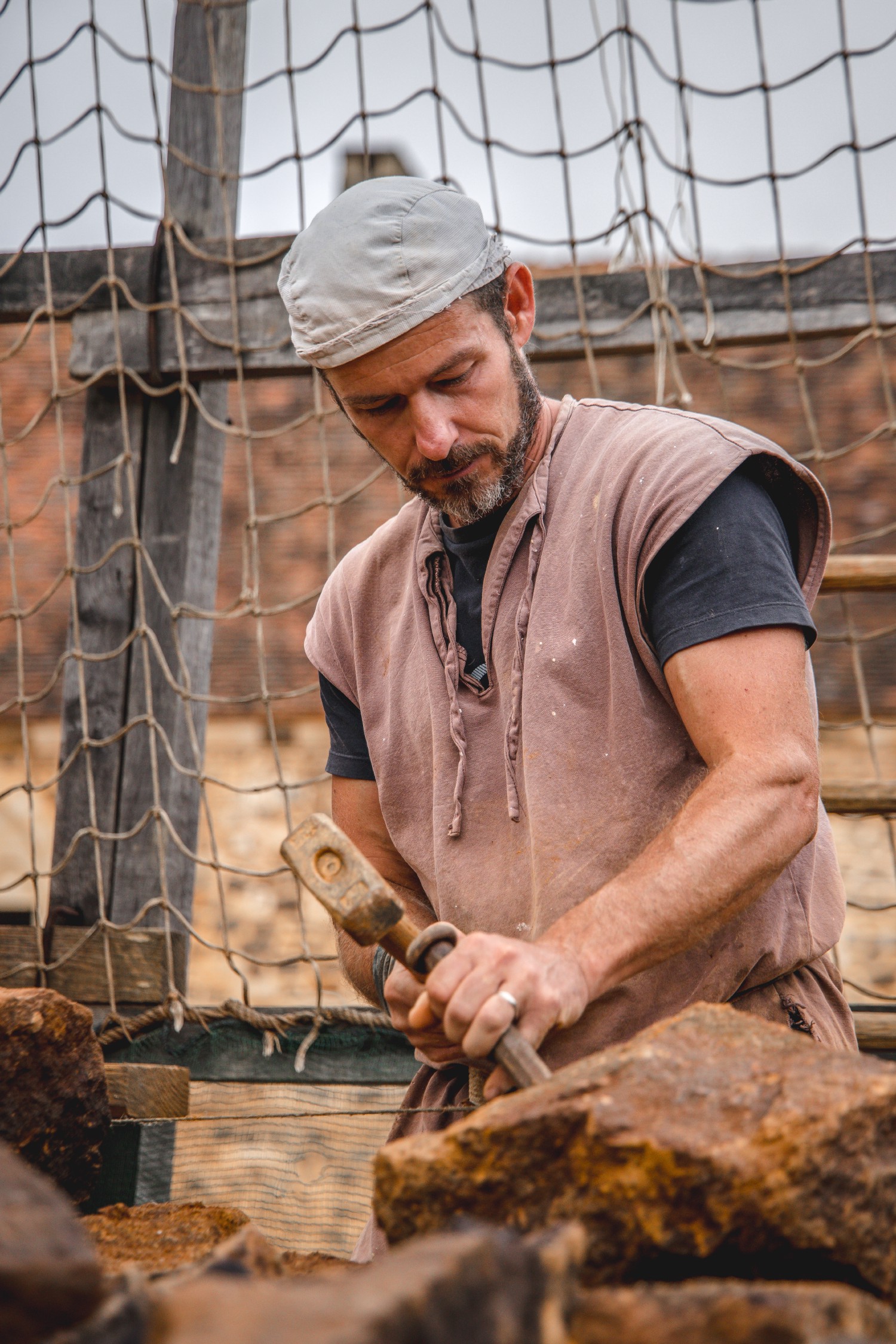 The Guédelon stone cutters work either on the cutting site located at the exit of the ferruginous sandstone quarry or, as here, on the construction site itself, or even in the workshops dedicated to the preparation of ornamental stones. In the Middle Ages, the stones were often first roughed and pre-calibrated directly in the quarry to limit the significant cost of transport which, over a distance of eleven miles (18 km), doubled their cost price. The job of the stonemasons was to give shape to the stones intended for the work of the masons.
