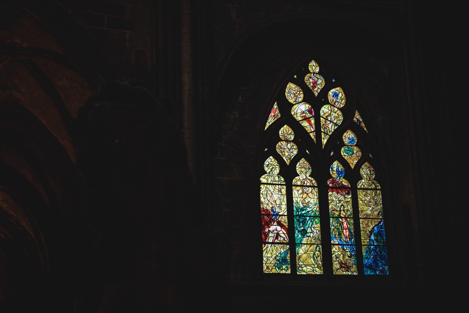 From 1958 to 1968, Marc Chagall ornated Saint Stephen Cathedral with his stained-glass windows with the help of Charles Marq and Brigitte Simon. Their ancestors have been master glassmakers since 1640. Sixteen windows adorn the triforium of the cathedral with crude colors and tortured lines. They reinforce the genesis of the Creation that the artist develops on the four lancets of the north transept. They depict Adam being placed in a large garden by a two-faced angel.