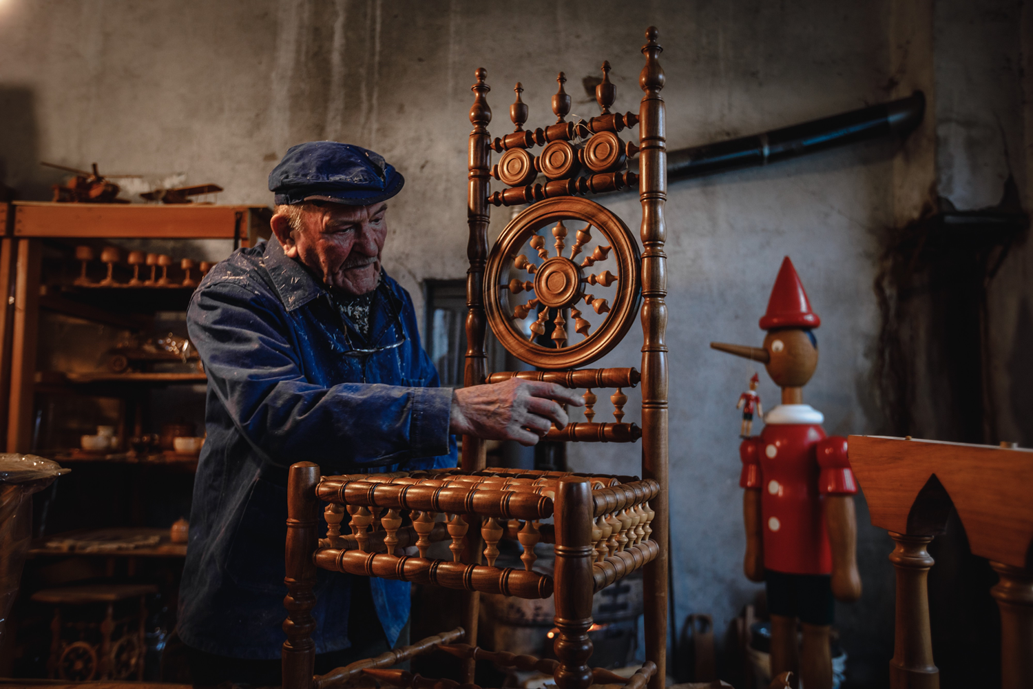 In his Arinthod workshop in the Jura department, Robert Marichy exhibits exceptional pieces such as this very ornate chair with skilfully assembled pieces or the twenty-three turned wood masterpieces of the ‘Meilleur Ouvrier de France’ (Best Worker in France) competition that he took on the challenge of reproducing. He also collects some favorite items visible on the shelves in the background. Among them, a collection of egg cups and eggs in one hundred and ten different species which illustrates the variety of the woods worked by this boxwood lover.