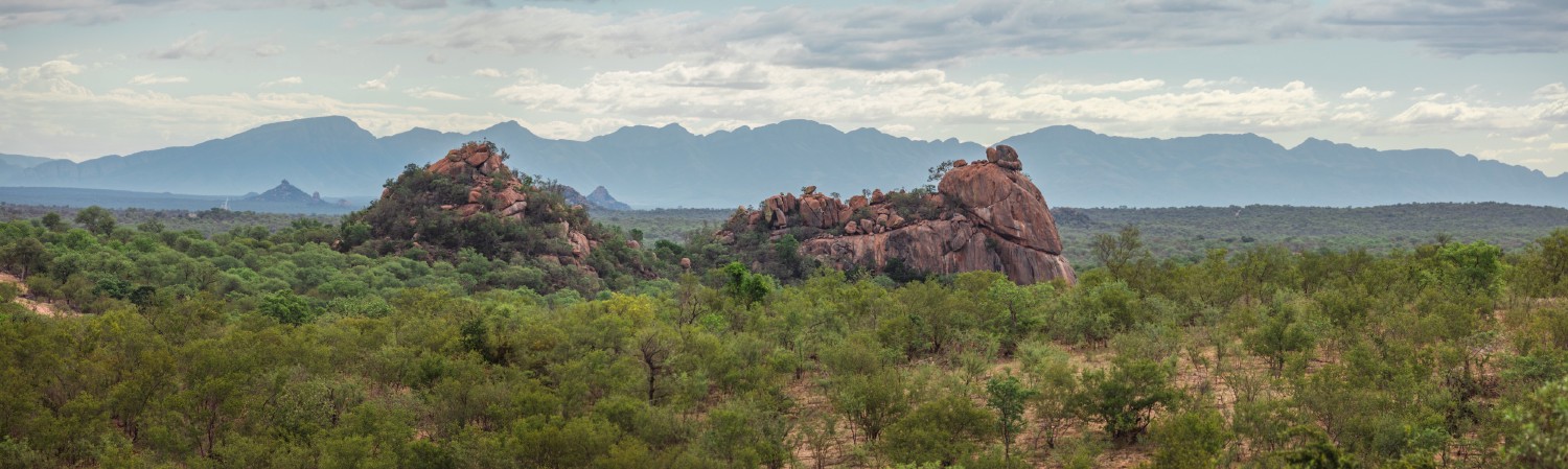 The Drakensberg mountains, here in the background, cross the eastern part of South Africa over a thousand kilometers. It culminates at 11423ft (3482m) in Lesotho. In the South African bush and southern Africa, there are also many kopjes, these rocky formations born from erosion, prized by local flora and fauna, like here in the forefront.