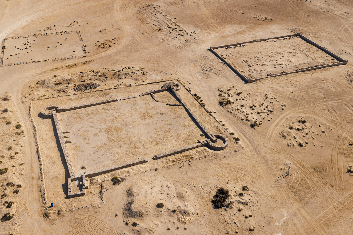 Aerial views of the quadrangular fort of Zekreet, west of Qatar, allow us to see – to the right of the fort – the ruins of an imposing ‘madabi’ (date press) for the production of date syrup. The absence of a palm grove in the region suggests a possible commercial relationship between Qatar and Bahrain at the beginning of the 19th century, with dates arriving by boat. Excavations at the site have established that life was organised in unbuilt structures and perhaps on a seasonal basis. The artisanal activity of the madabi was complemented by livestock breeding (goats and dromedaries) and pearl oyster fishing, attested by a large deposit of shells.