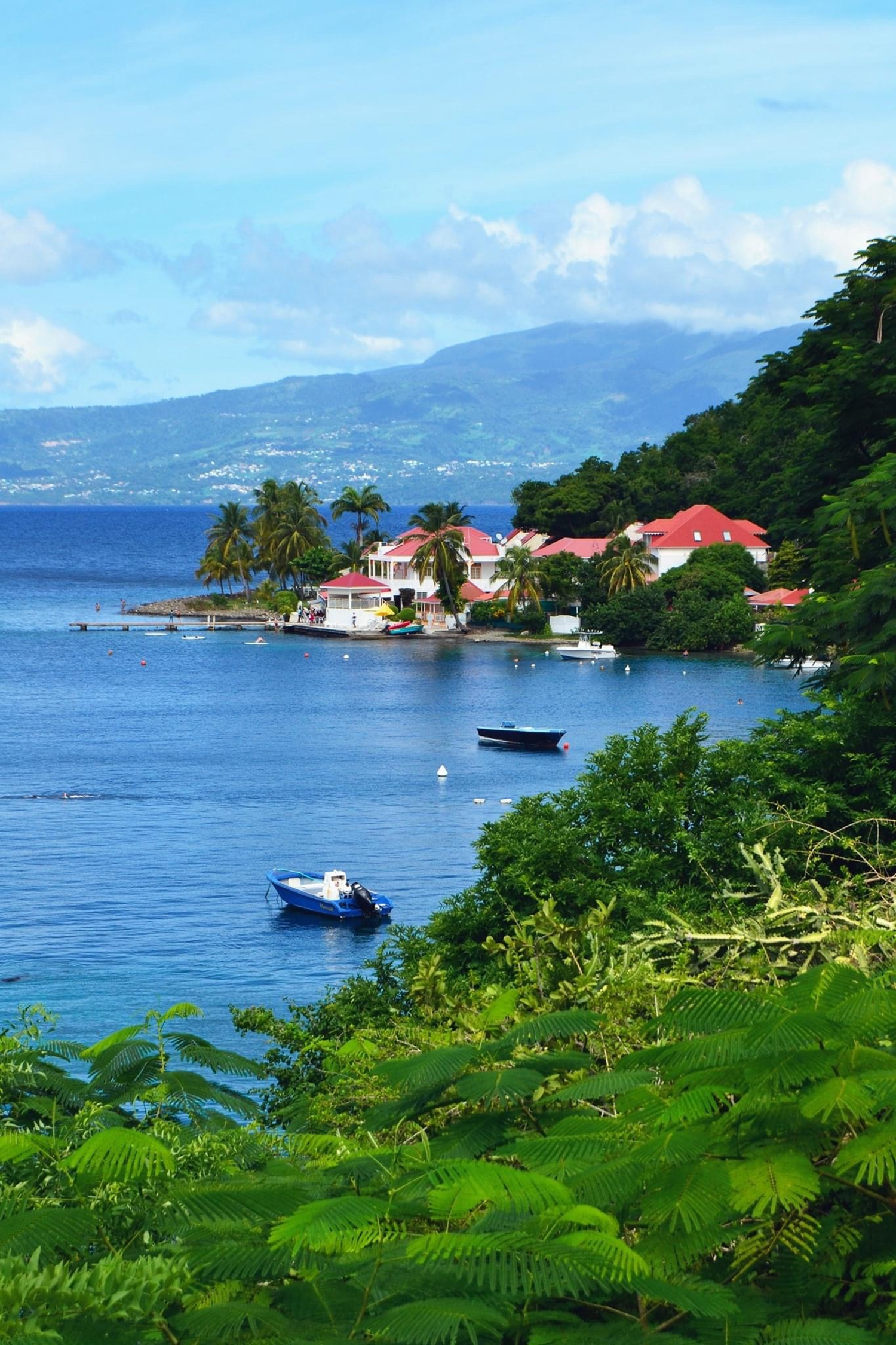 J4 de nos vacances en Guadeloupe : arrivée en bateau sur l’île principale « Terre de haut » des Saintes sous un grand soleil. Île avec un peu de relief et des petites maisons sur la côte.