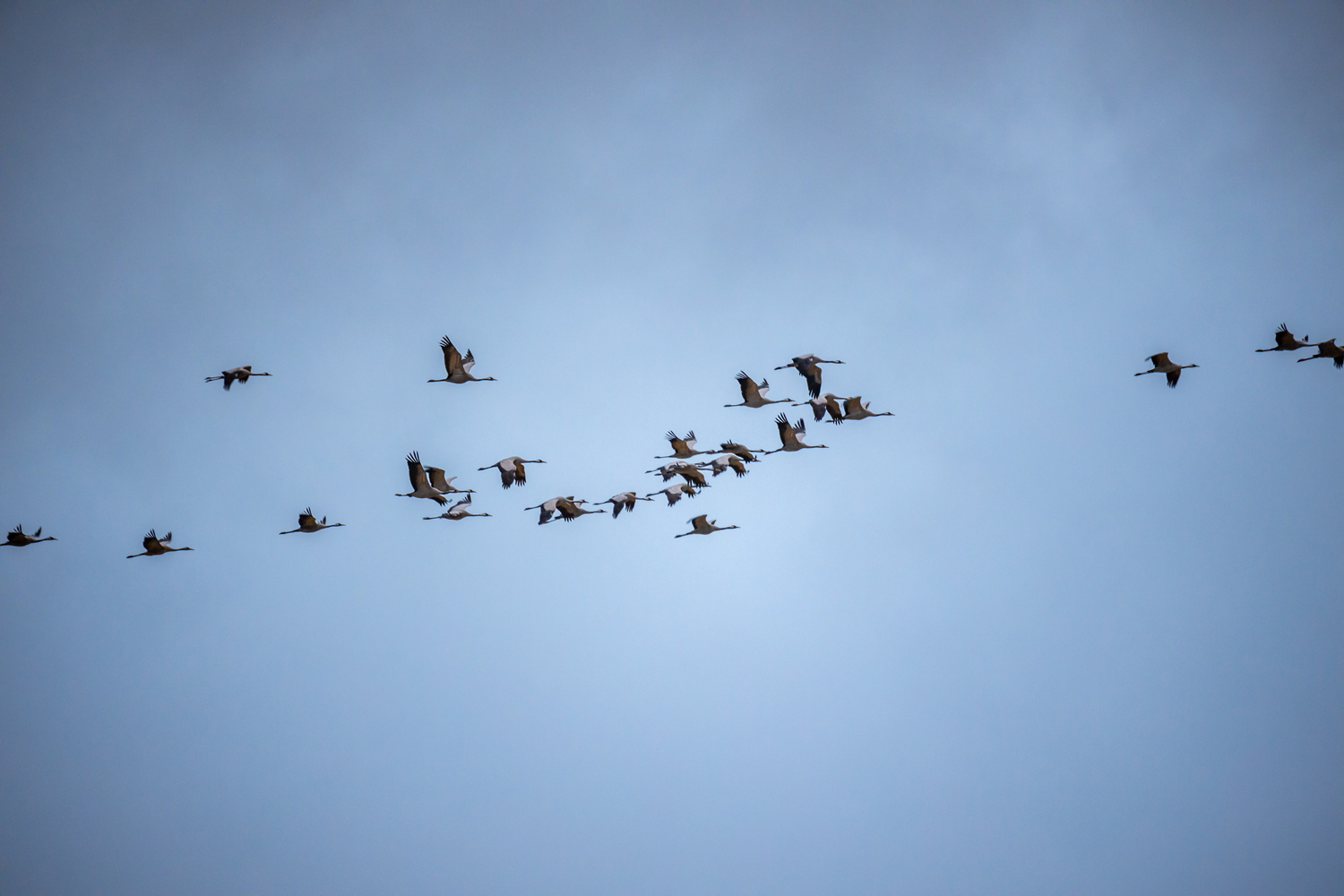 Common Cranes (Grus grus) fly with their necks and legs stretched out. In migratory flight, cranes generally adopt a V formation. They regularly break this formation to gain altitude when warm air rises. They then return to their original direction of flight but in a slightly looser configuration. The flapping of the wings creates a small disturbance behind the bird. A sort of micro vortex rising and then falling according to the rhythm of the wings. The cranes line up behind each other and benefit from the rising air thus created, which saves their strength.