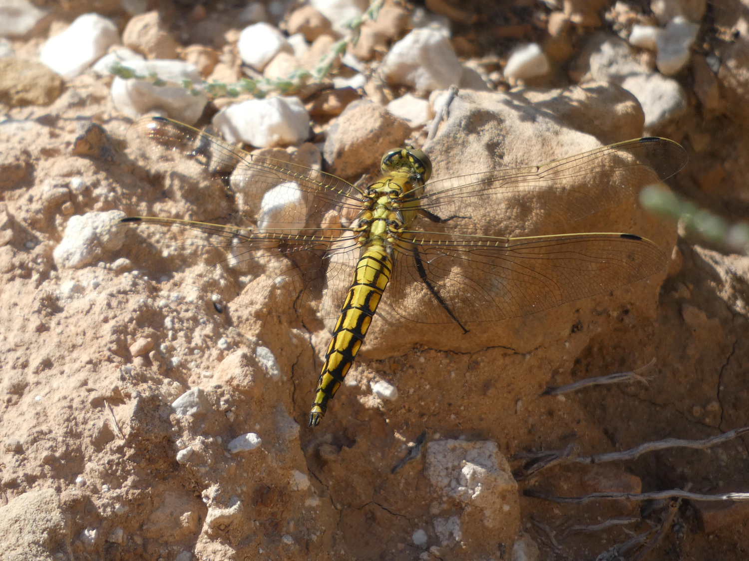 Espectacular hembra de Orthetrum cancellatum. Con esos llamativos colores amarillo oro y ribetes negros en sus segmentos. Conocida en castellano como “libélula azul”, cierto es que en el macho se da esa circunstancia. Pero a la vista está que ese no es el color definitorio en las hembras. Descripción:
