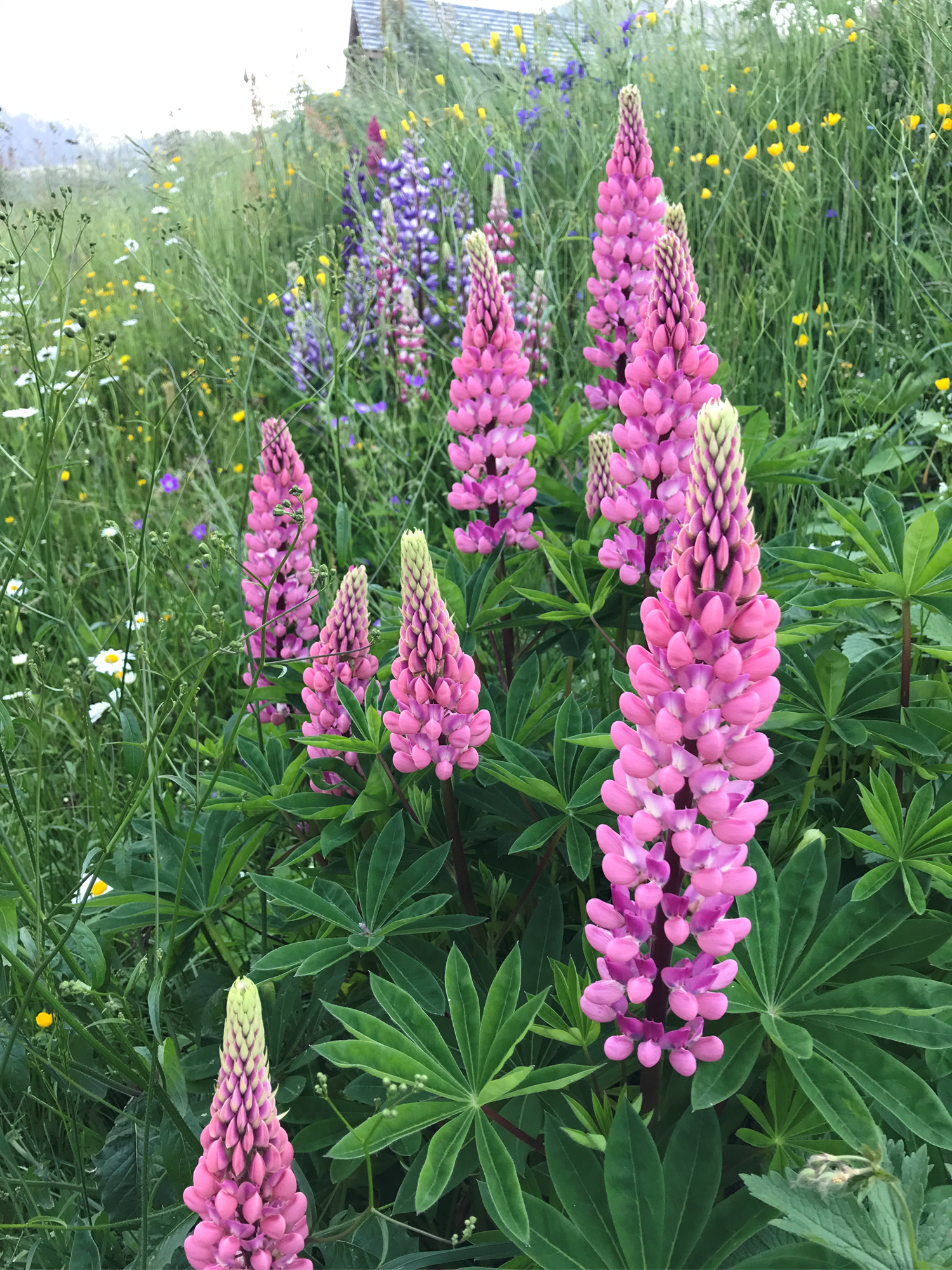 Le Lupin des jardins est une plante herbacée vivace de la famille des Fabacées. Il peut atteindre jusqu’à 60 centimètres de haut. Il en existe plusieurs variétés qui se sont échappées des jardins et se sont hybridées. Ici une variété à fleurs roses, qui s’est installée dans une prairie naturelle de Haute Savoie