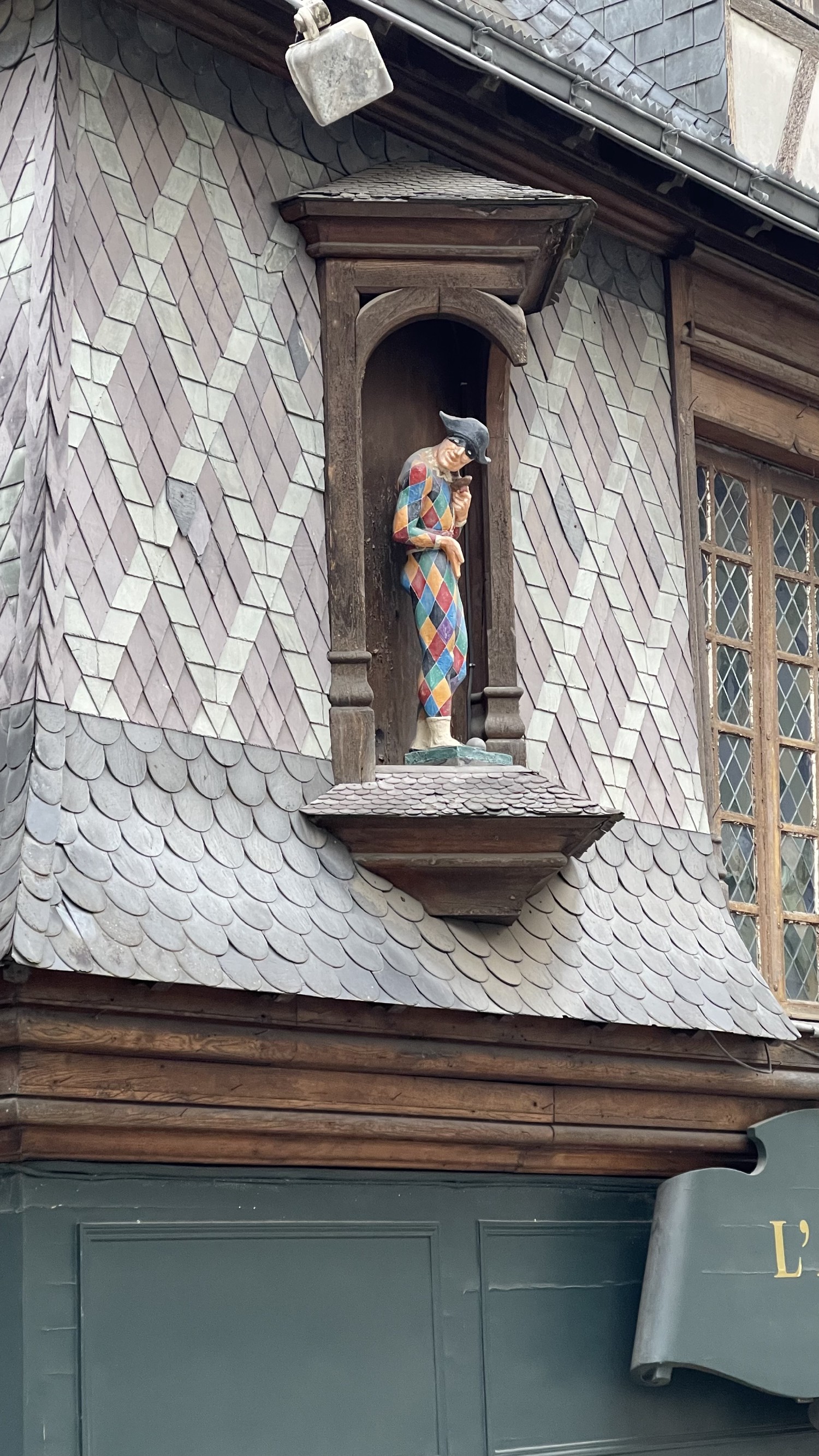 Statue en bois vue dans le centre-ville d’Angers ( Maine et Loire ) . Arlequin (en italien : Arlecchino) est un personnage type de la commedia dell'arte qui est apparu au xvie siècle en Italie, au masque noir et dont le costume est fait de losanges multicolores. Ceux-ci représenteraient les multiples facettes d'Arlequin, ainsi que sa pauvreté.