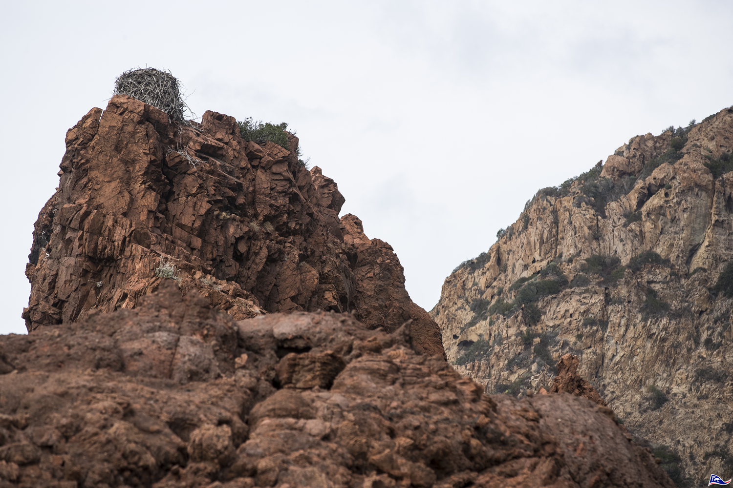 The Osprey, also called the Alpana, lives near ponds, rivers or by the sea, where it can easily feed. In Corsica, breeding pairs are located in the cliffs and islets of Scandola. For 2 to 3 weeks, the male builds a nest of 1 to 1.5 m ( 39 to 59 in) in diameter with dead branches, on a site with a wide visual field. Everyday, it performs a courtship ritual close to the nest to attract a female. It then offers the female a fish so that it stays and it agrees to mate.