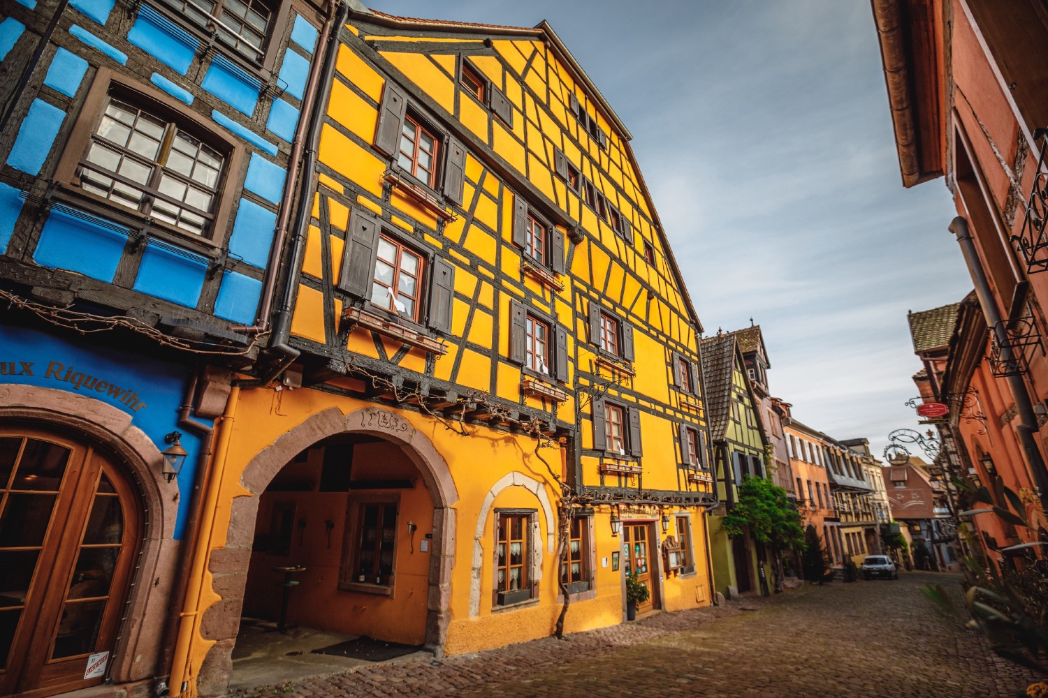 Colorful, decorated, and flowery, the Alsatian half-timbered house contributes to the image of this region of eastern France. With the abundance of large forests around Riquewihr, wood has naturally become the first choice of raw materials. The house is shaped like a wooden frame that serves as a solid bone structure, without screws or nails. The walls are erected thanks to a mortar composed of mud and straw. The whole is covered with lime, often white, sometimes blue (color of the Virgin), red, ocher, green or yellow. The steep roof, up to 60 °, is designed to prevent snow from accumulating.