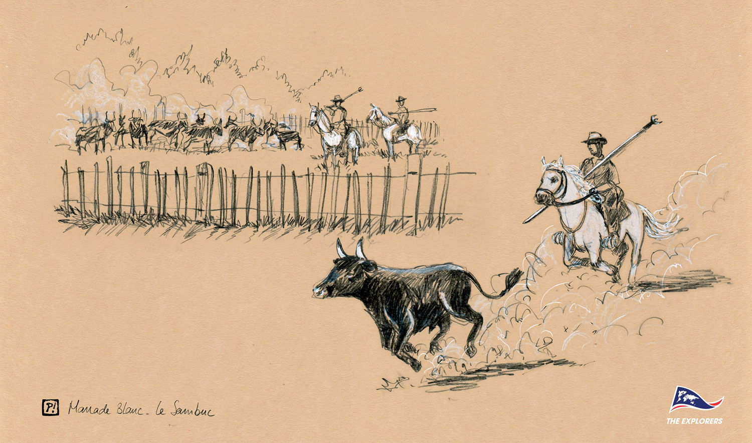 Entre Arles et la mer, rendez-vous au Sambuc à la Manade Blanc pour découvrir le travail des guardians auprès des taureaux et de leurs chevaux.