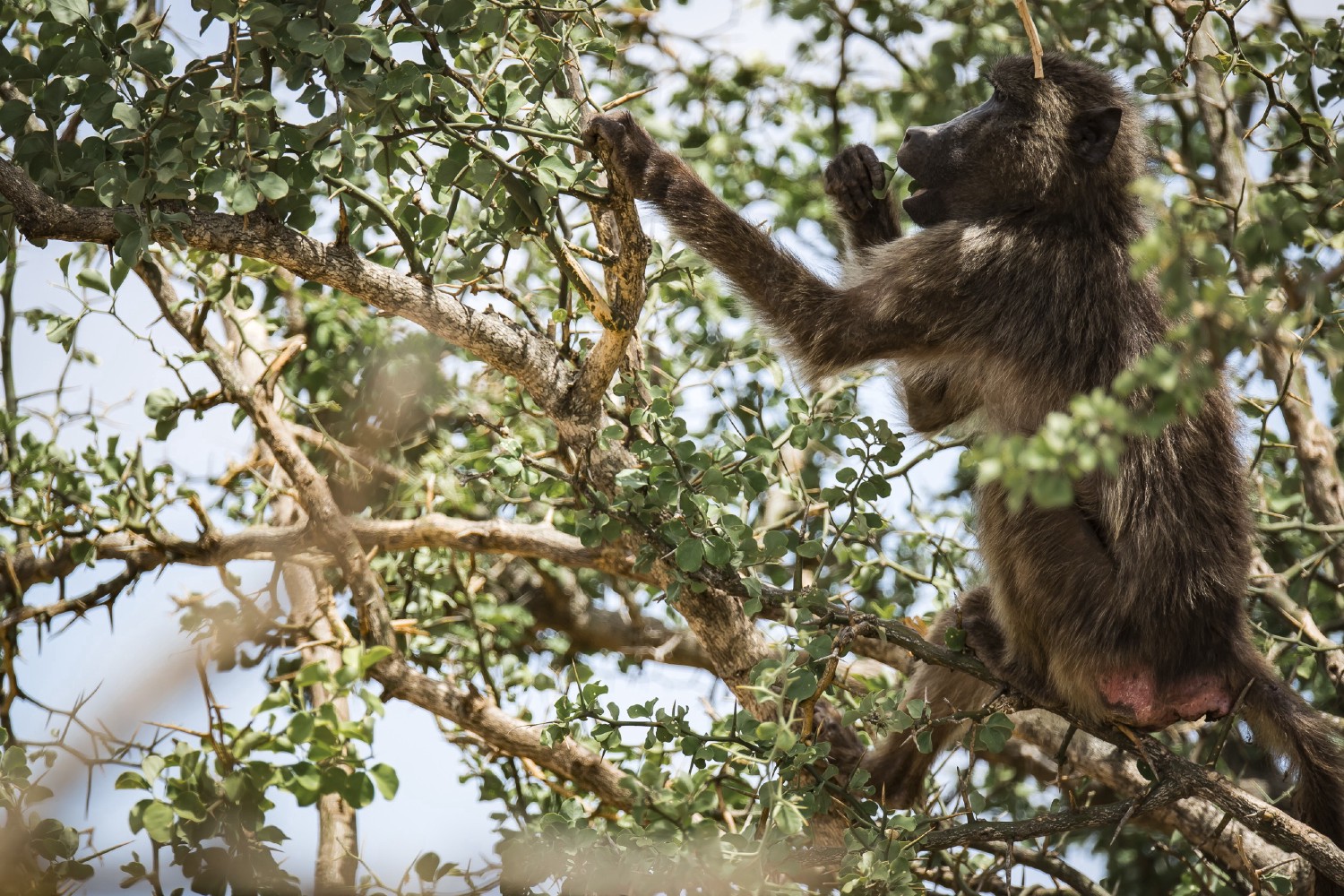 Baboons have a great manual dexterity that allows them to access various sources of food on the ground and in trees. They use their hands to pick and bring food to their mouth but also to dig out bulbs or roots in the soil, which will save them during drought and in arid areas.