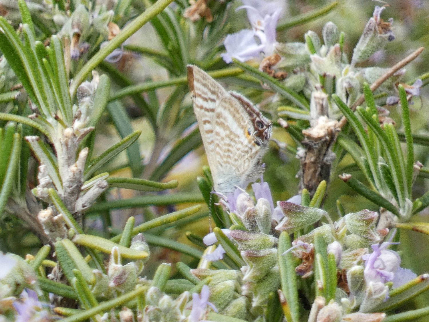 El macho tiene el anverso de color violeta oscuro, con finos márgenes oscuros en ambas alas, y puntos negros en el ángulo anal del ala posterior, de donde parte una larga cola; el reverso es ocráceo con bandas claras y oscuras transversales en ambas alas, con una destacada banda transversal blanca en la zona postdiscal del ala posterior y pequeños ocelos verde-azules en el ángulo anal, en el inicio de la cola. La hembra tiene el anverso de color predominantemente pardo, con áreas violeta en el ala anterior, siendo su reverso similar al del macho. Envergadura alar: entre 26 y 34 mm.
