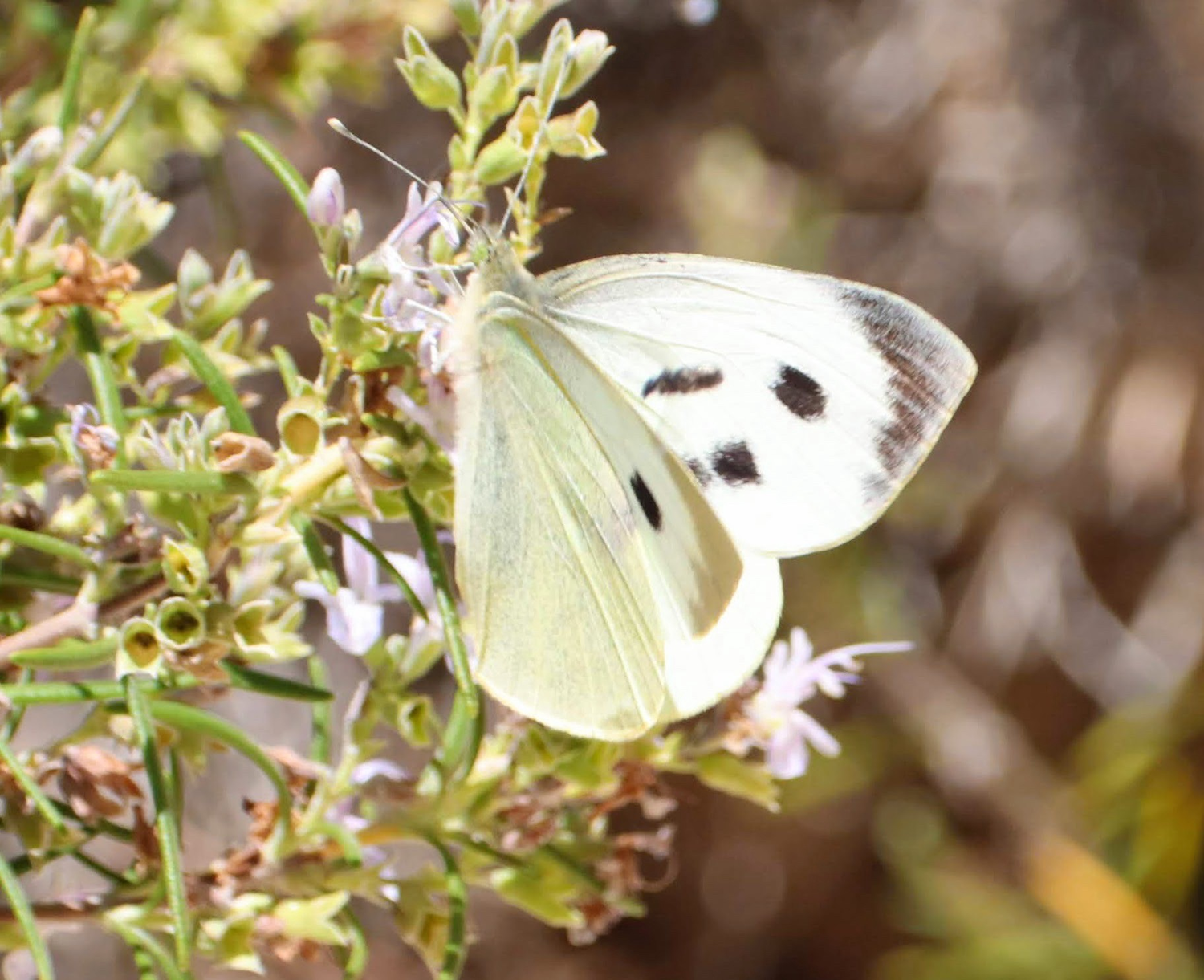 Los adultos miden entre 50 y 60 mm de envergadura, los machos menores que las hembras. Son de color blanco, a excepción de costa o zona apical. Las hembras se distinguen fácilmente de los machos ya que tienen dos puntos negros en cada una de sus alas anteriores. En las alas posteriores también aparece un punto en su margen anterior. Las manchas negras normalmente son más oscuras en las generaciones nacidas en verano. Ventralmente son de color verde pálido de modo que quedan mimetizadas cuando se posan entre los arbustos.