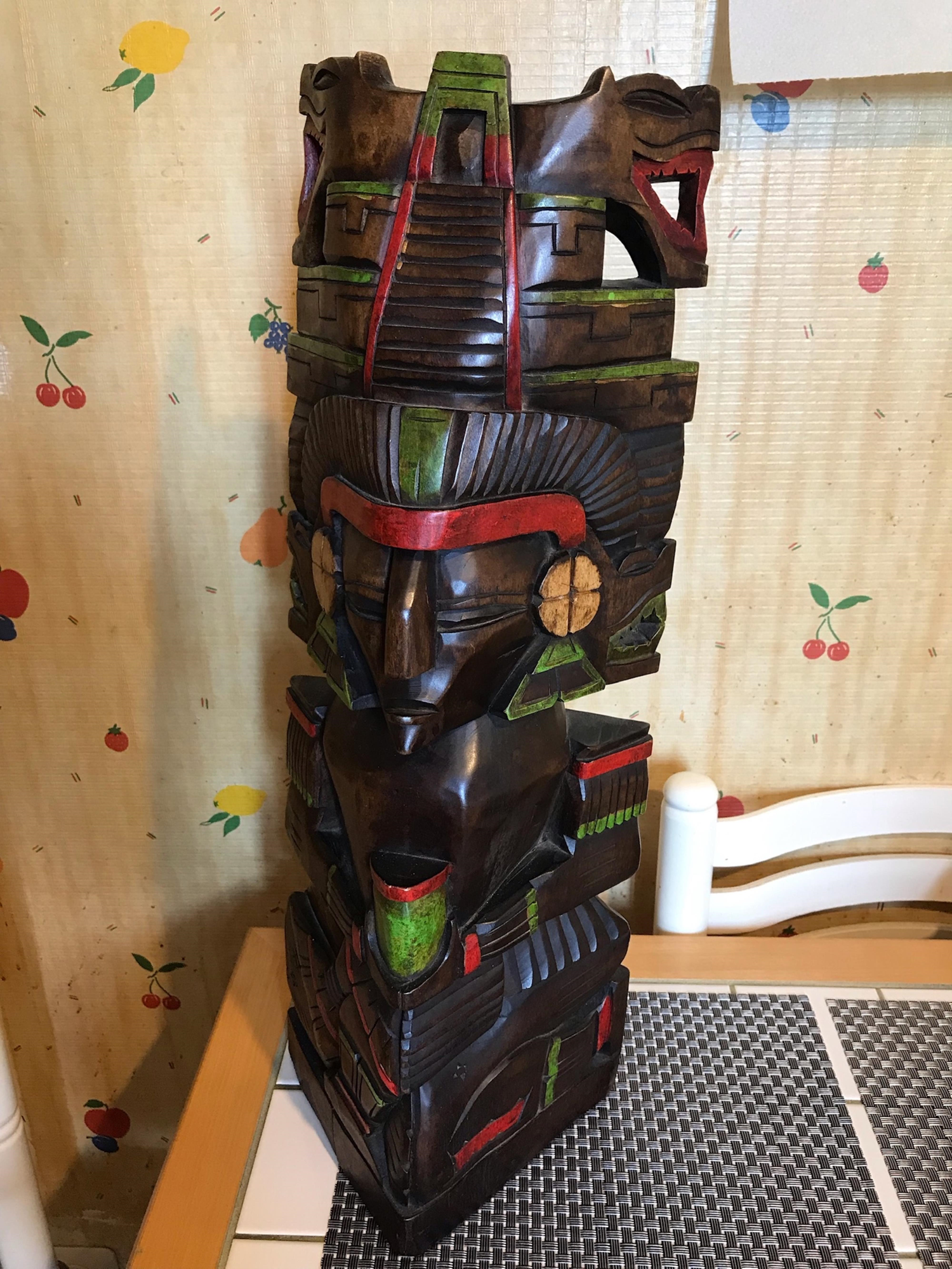 Masque en bois joliment sculpté et bariolé représentant un Empereur Aztèque.