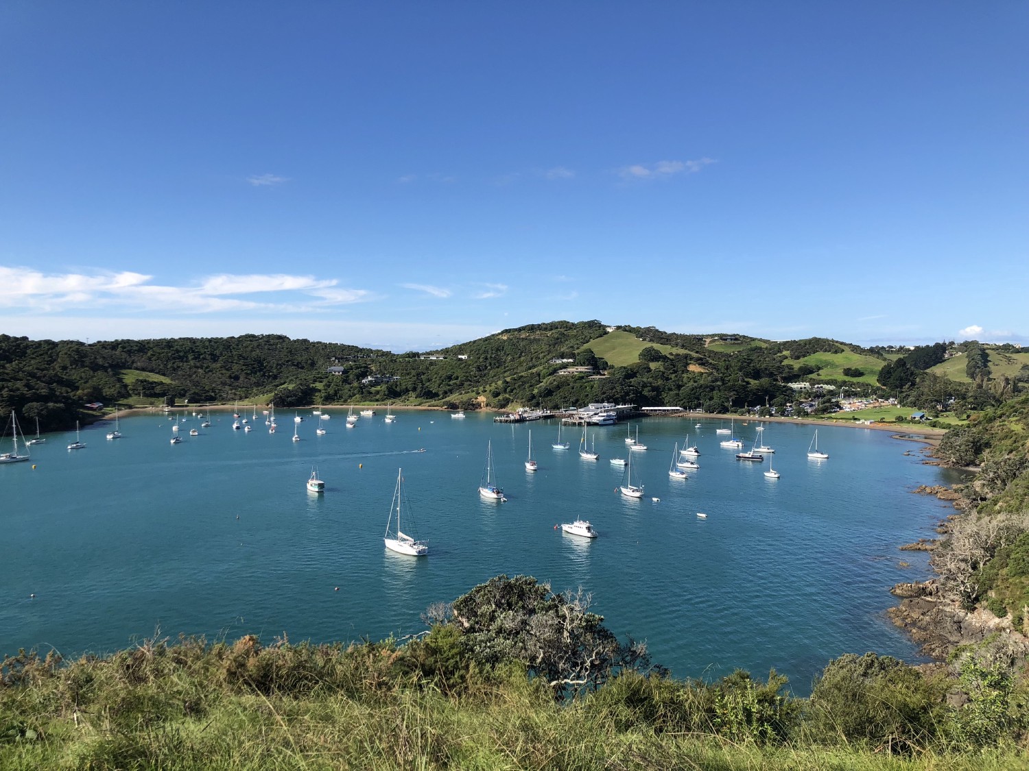 A panoramic view of Matiatia Bay on Waiheke Island, New Zealand. Almost all ferries between the main island and Waiheke are berthing at Matiatia Bay.