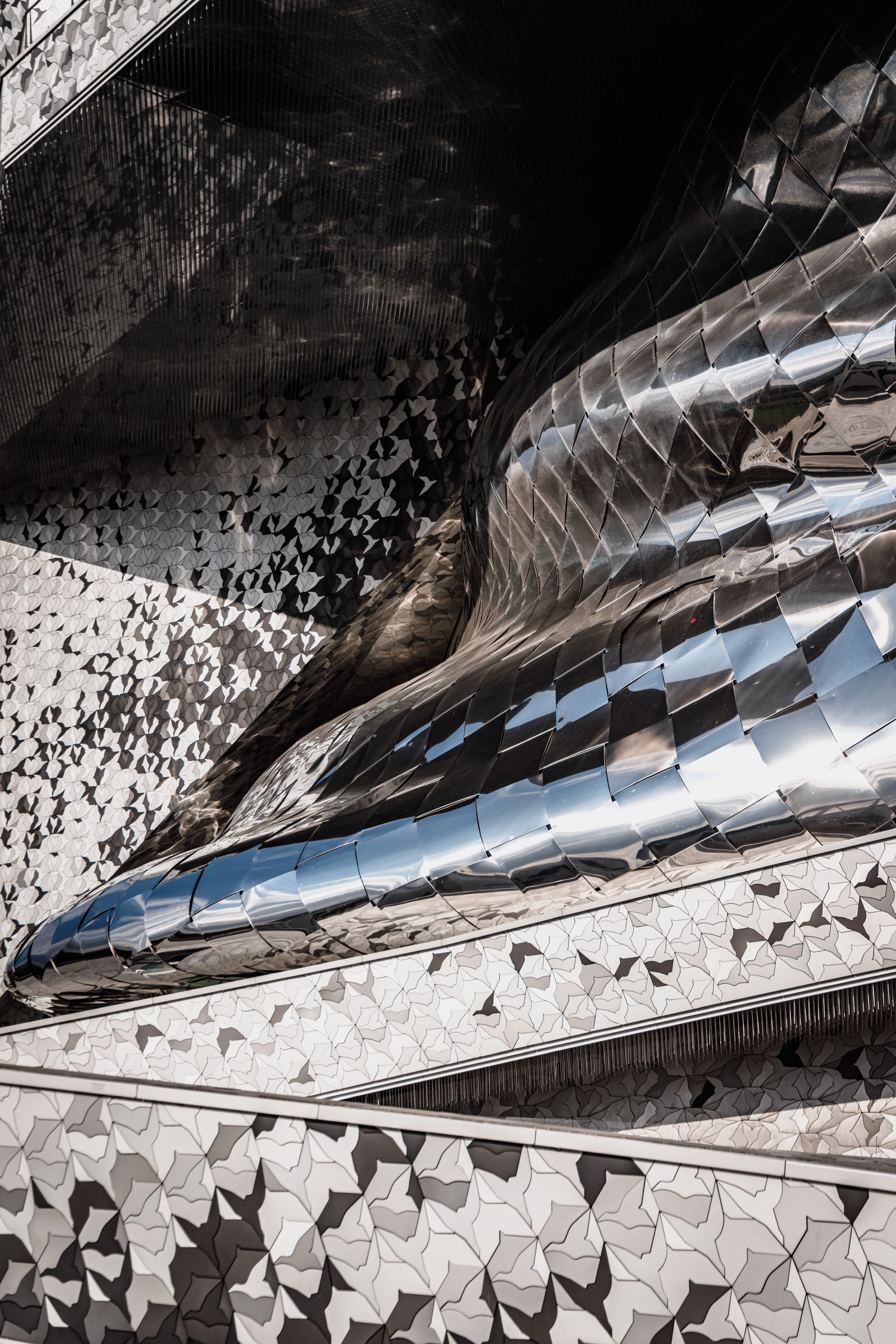Architect Jean Nouvel was inspired by the graphics and optical illusions of the Dutch artist M. C. Escher for the geometric cutting and positioning of the 340,000 bird silhouettes that adorn the facades, the forecourt and part of the roof of the Philharmonie de Paris. The birds come in seven shapes and four shades of grey. Those on the facades are made of aluminium, the others of concrete. Their matt tones change according to the light and contrast with the shiny stainless steel scales that are criss-crossed, concave, convex or almost flat.