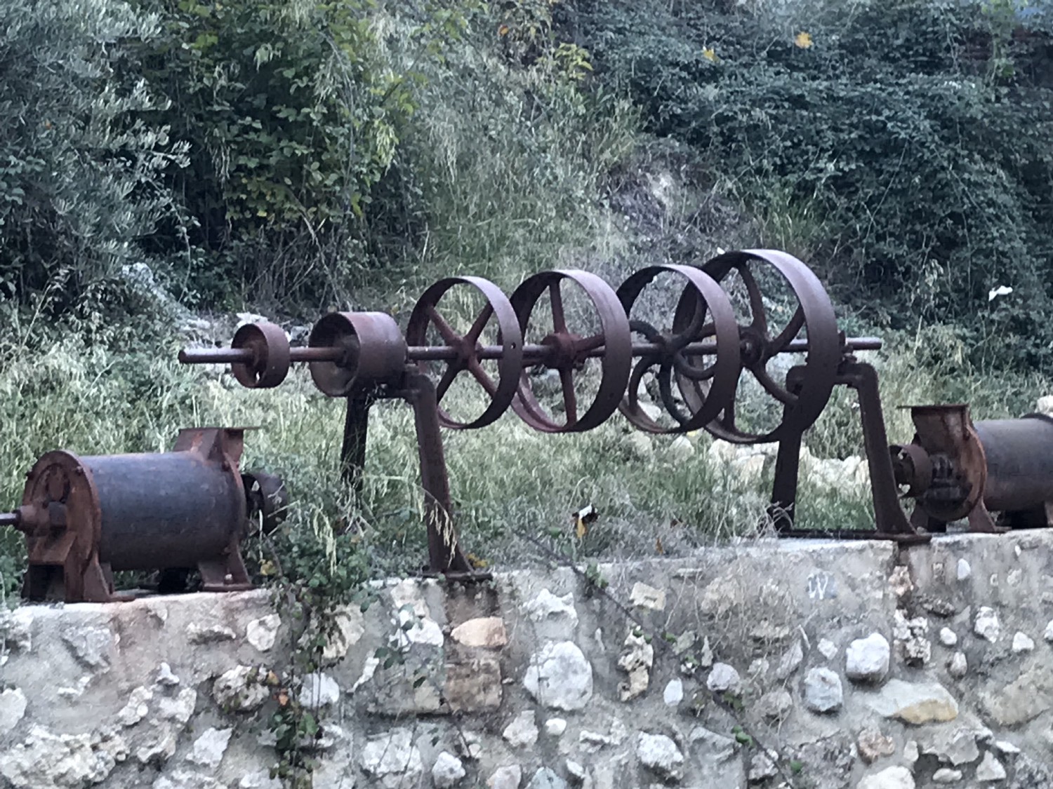 Sur la friche industrielle, sont exposés les anciennes vis qui actionnaient les roues du moulin à eau du Rio castril