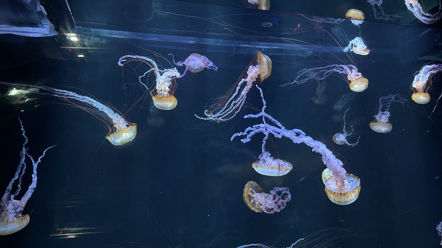 Nausicaa - Centre National de la Mer de Boulogne - sur -Mer ( Pas de Calais ) . Cette méduse tient son nom de la couleur de son ombrelle blanche et jaune qui ressemble à un œuf au plat. Elle possède huit bras garnis de centaines de tentacules. On la retrouve principalement dans la Méditerranée. Elle peut dériver sur les plages au gré des courants mais elle est sans danger pour l'homme.
