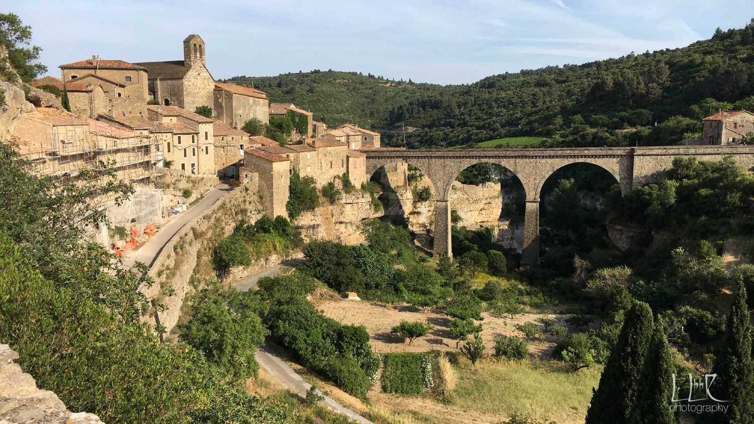 Le pont-viaduc du XXe siècle, l’église Saint-Etienne des XIe et XIIe siècles et les remparts en cours de restauration.
