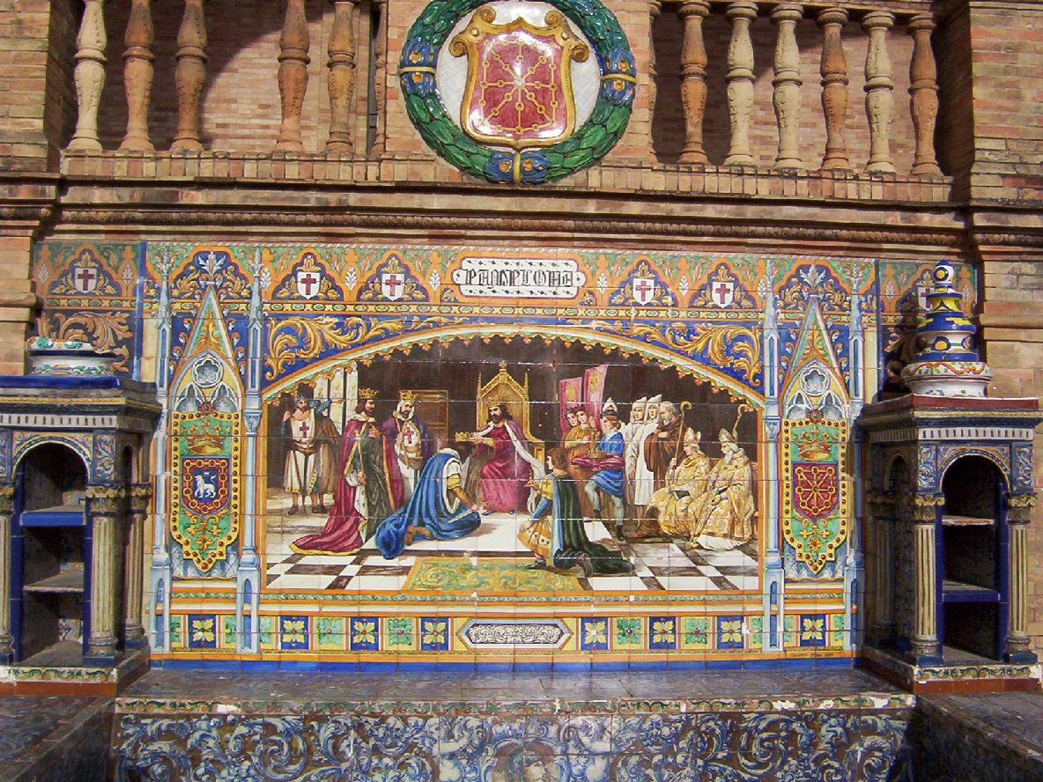 Les bancs et des ornements en céramique peinte (azulejos) sont adossés aux deux ailes du palais de la place d'Espagne, conçue l'exposition ibérico-américaine de 1929.