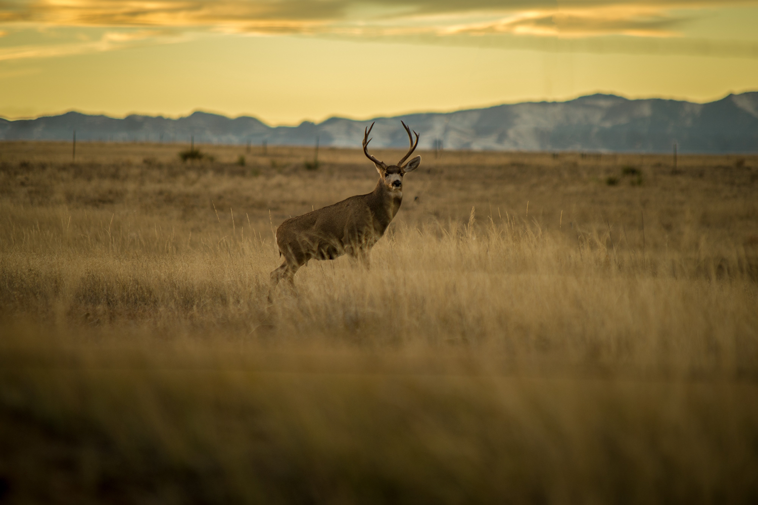 A mule deer stands erect on the plains in front of the Front Range of the Colorado Rockies.