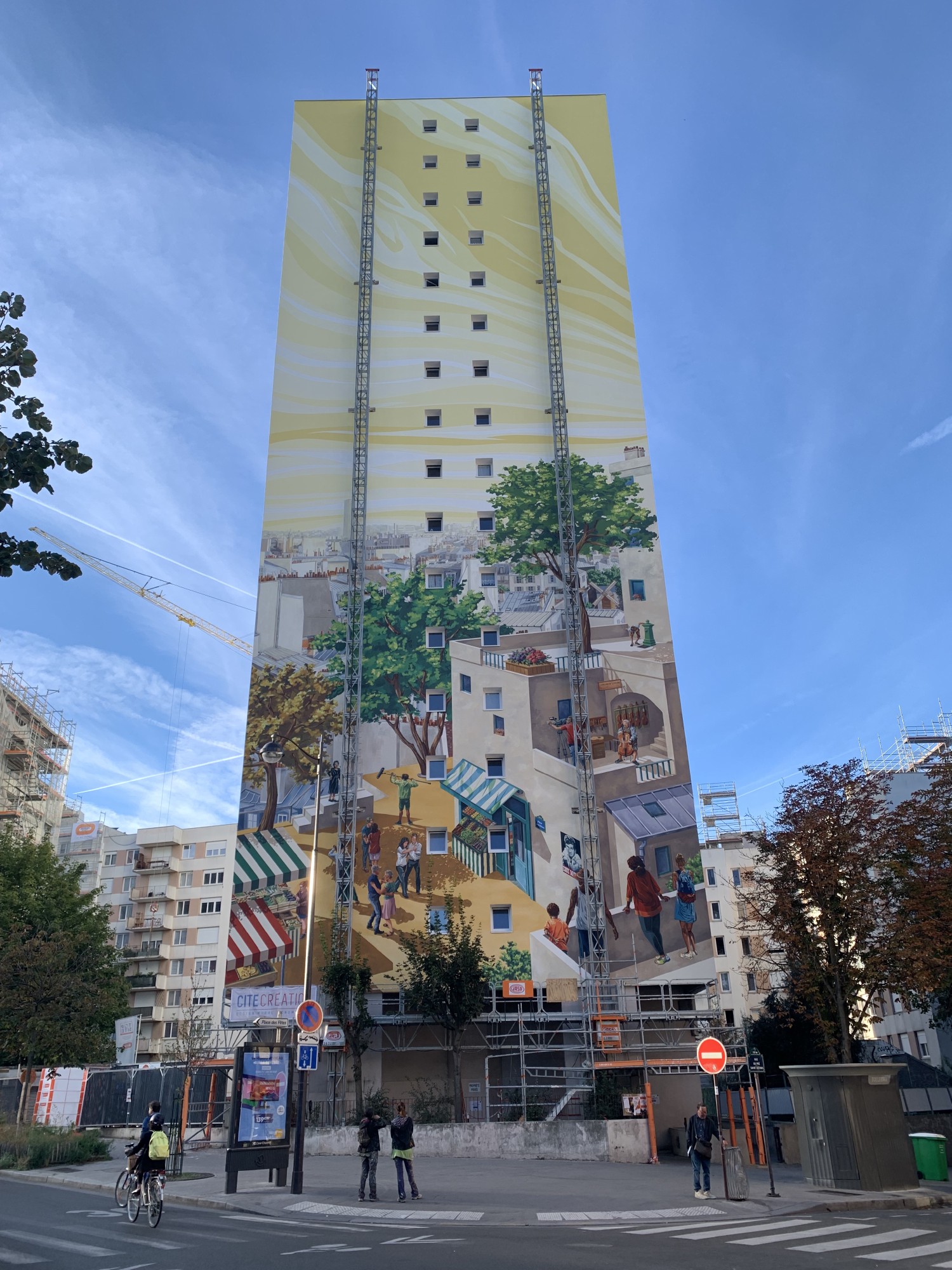 10 jours après la photo prise le 1er septembre 2022, le projet avance. Des personnages apparaissent, des étals de boutiques s’installent, la place est nommée (Place des Fêtes) et elle est symbolisée par des danseurs et un hommage à Edith Piaf, enfant du quartier qui, à sa naissance, vivait 72 rue de Belleville.