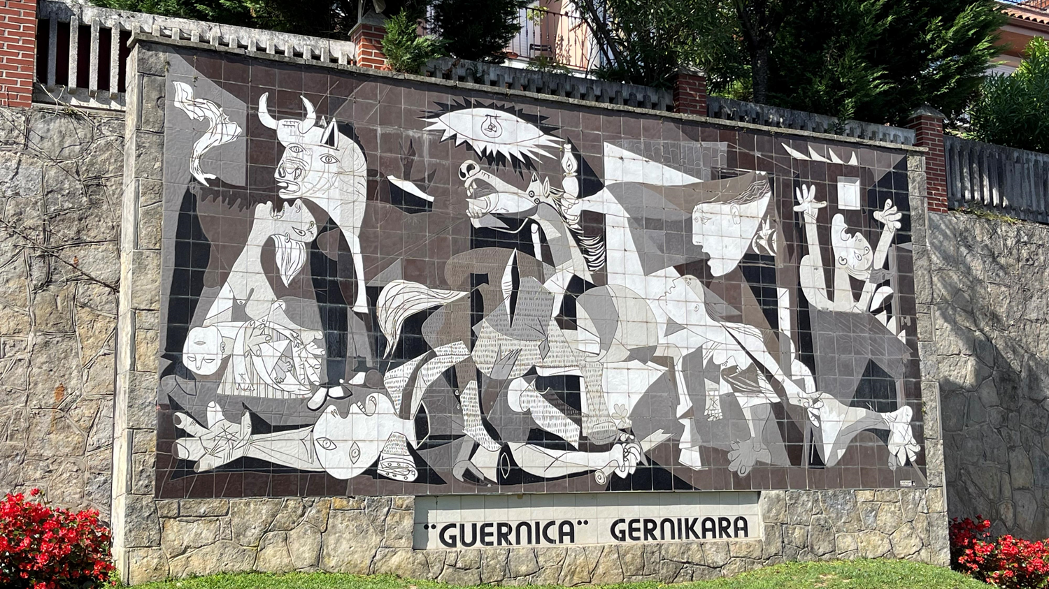 Guernika-Lumo ( Bizkaïa - Euskadi ) . Chaque carreau de la mosaïque donne forme au puzzle génial créé par l’imagination de Pablo Picasso. Guernica, oeuvre au prestige international incontesté que l’on peut admirer aujourd’hui au Musée Reina Sofía à Madrid. L’inscription que l’on voit sous l’impressionnant mural, exprime le voeu des habitants de Gernika que le tableau puisse être exposé un jour dans la ville qui servit d’inspiration à son créateur : Gernika.