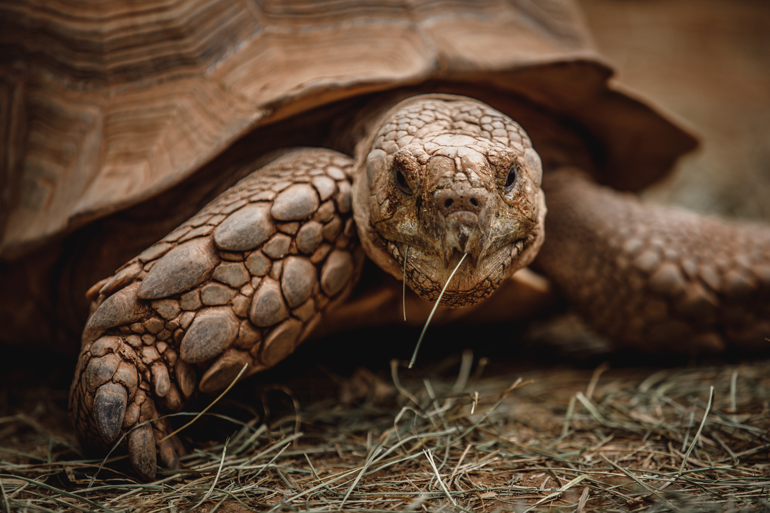 The legs of Hermann's tortoises (Testudo hermanni) are particularly muscular and allow them to lift their weight that can reach 2.2 lbs (1 kg) during adulthood. The front legs, significantly stronger and more developed than the hind legs, are terminated with five fingers linked together and fitted with claws that allow the tortoise to dig the earth to hibernate. The legs of Hermann's tortoises are covered with fine scales like the rest of their skin.