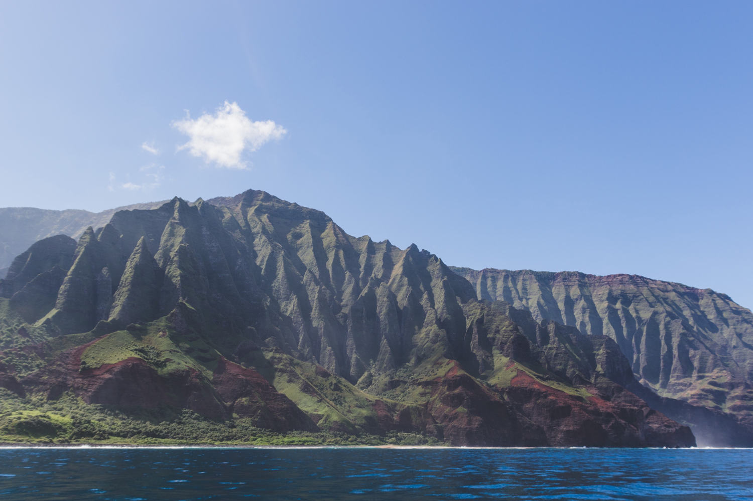The na pali (meaning high cliffs) along the shoreline rise as much as 4,000 feet (1,200 m) above the Pacific Ocean.
