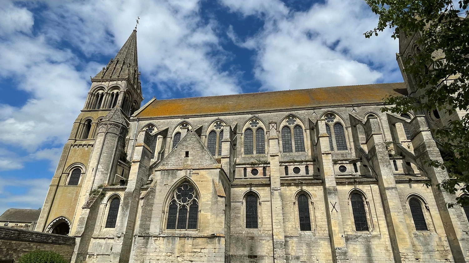 Saint-Leu-d’Ésserent ( Oise ) . vue générale depuis le sud . Les élévations latérales, visibles de loin, et dominées par les trois tours, sont imposantes du fait de la répétition de la même disposition pour les bas-côtés et la nef sur six travées, ou huit travées si l'on fait abstractions des légères différences que présentent les deux premières demi-travées du chœur. L'ornemention est caractéristique de la première période gothique : la toiture retombe sur une corniche formée par un double rang de têtes de clous ou pointes-de-diamant, et ce même motif est également utilisé en haut des arc-boutants ; en haut de l'étage du triforium ; et encore à l'intérieur des cercles qui entourent les oculi hexalobes des fenêtres hautes de la cinquième et sixième travée au sud seulement (sur les quatre premières travées, on trouve des billettes). Les fenêtres hautes de la nef sont inspirées de la cathédrale de Soissons, et se présentent comme des paires de lancettes simples surmontées de l'oculus hexalobe déjà mentionné, inscrites dans un arc de décharge commun. Non décorées à l'intérieur de l'église (hormis les arc-formerets avec leurs colonnettes à chapiteaux qui appartiennent au voûtement), elles sont cantonnées de fines colonnettes monolithiques couronnées de chapiteaux à crochets, dont les tailloirs forment un bandeau mouluré continu sur toute la longueur de la nef (mais pas du chœur), et surmontées d'une archivolte torique. Cela vaut aussi pour les fenêtres hautes du chœur, et par ailleurs, pour celles des bas-côtés. Au niveau du chœur seulement, les fenêtres hautes retombent sur un larmier, et deux assises plus bas, des corbeaux, deux par travée, font saillie devant le mur : ce sont des traces de l'ancienne toiture des bas-côtés, jusqu'au début du xiiie siècle quand le triforium du chœur était encore une succession de galeries ouvertes sur les combles. Ensuite les toitures des bas-côtés avaient été ramenées à la forte pente qu'elles accusaient initialement autour du chœur, avant que Paul Selmersheim ne restitue l'état du xiiie siècle au cours des années 1890 grâce à une couverture par des dalles de béton. Grâce à cette intervention, l'arrière du triforium est de nouveau visible, éclairé par de toutes petites fenêtres étroites : deux lancettes en arc brisé encadrant un oculus pour la nef des années 1190-1200, et deux lancettes sans l'oculus au milieu pour le chœur, où la disposition date des alentours de 1210. Au niveau de la sixième travée, on remarque le raccordement des triforiums des deux camapagnes de construction : celui de la nef est moins saillant .