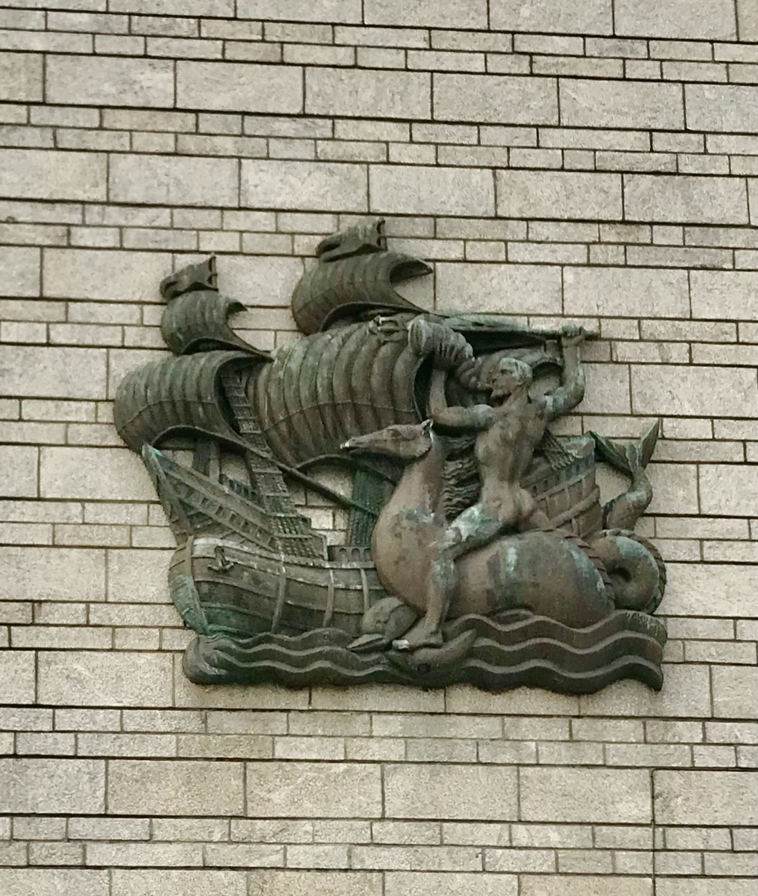 Ce Haut Relief installé en 1958 sur la façade de l’hôtel de ville, a été réalisé par le sculpteur parisien René Letourneur. Cette sculpture en bronze représente Neptune chevauchant un animal fabuleux, mi-cheval mi-poisson escorté de dauphins.
