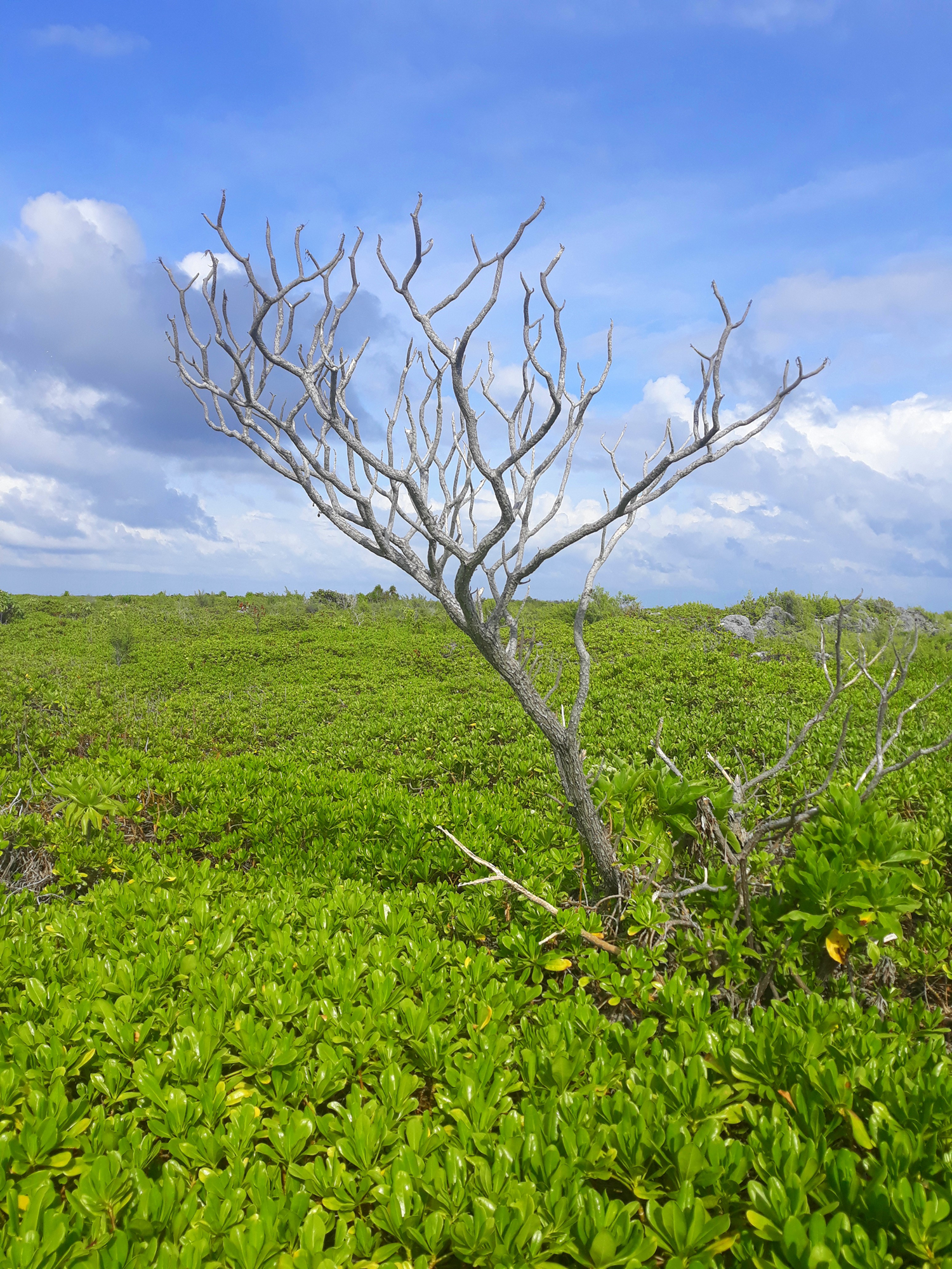 Tohinu sec, arbre très utilisé pour ses vertus médicinales. Celui-ci a poussé tout près d'une falaise de l'aéroport de Niau.