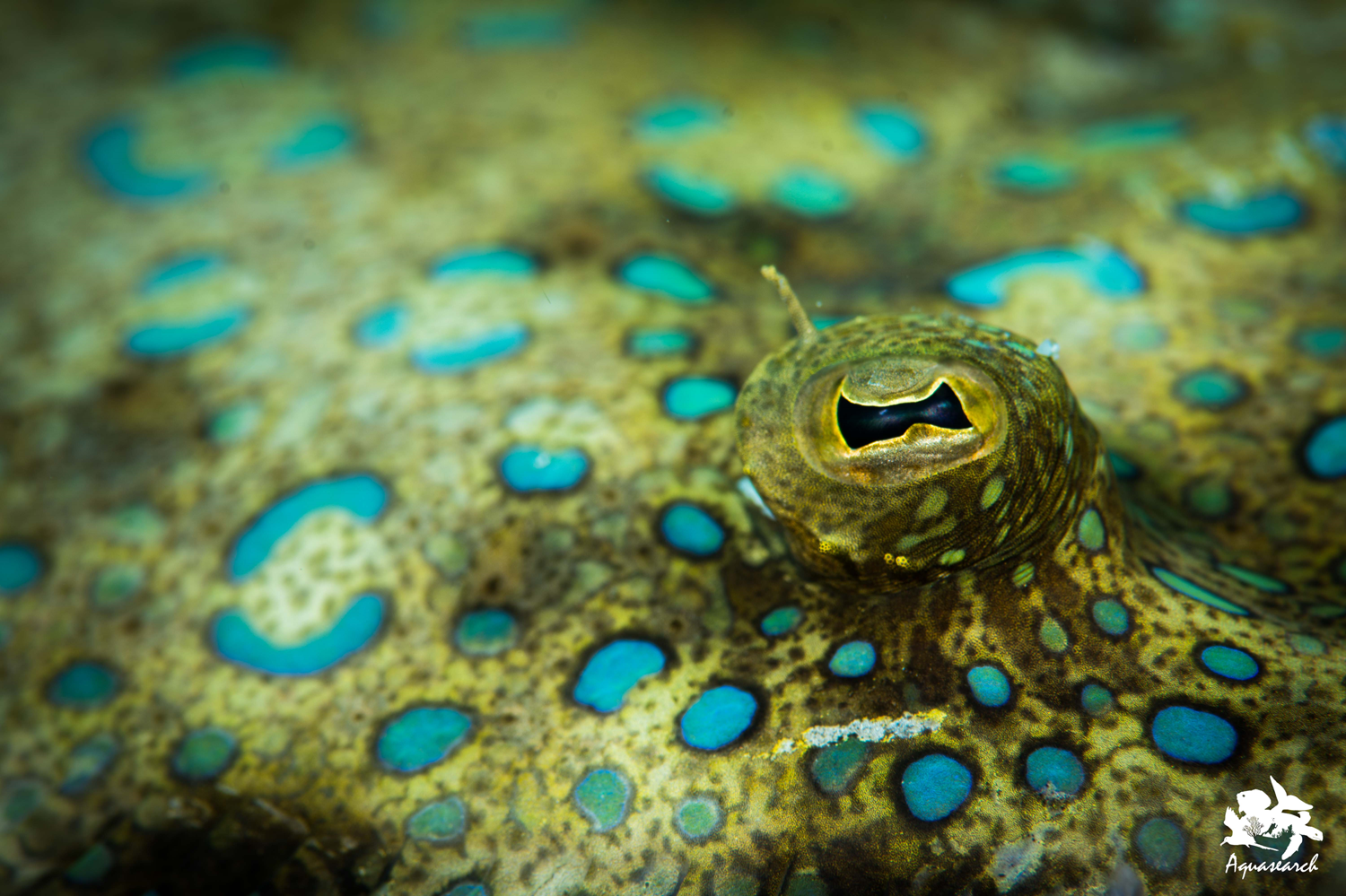 Photo macro de l'oeil d'un carrelet tropical, poisson plat qui se camoufle sur le fond.