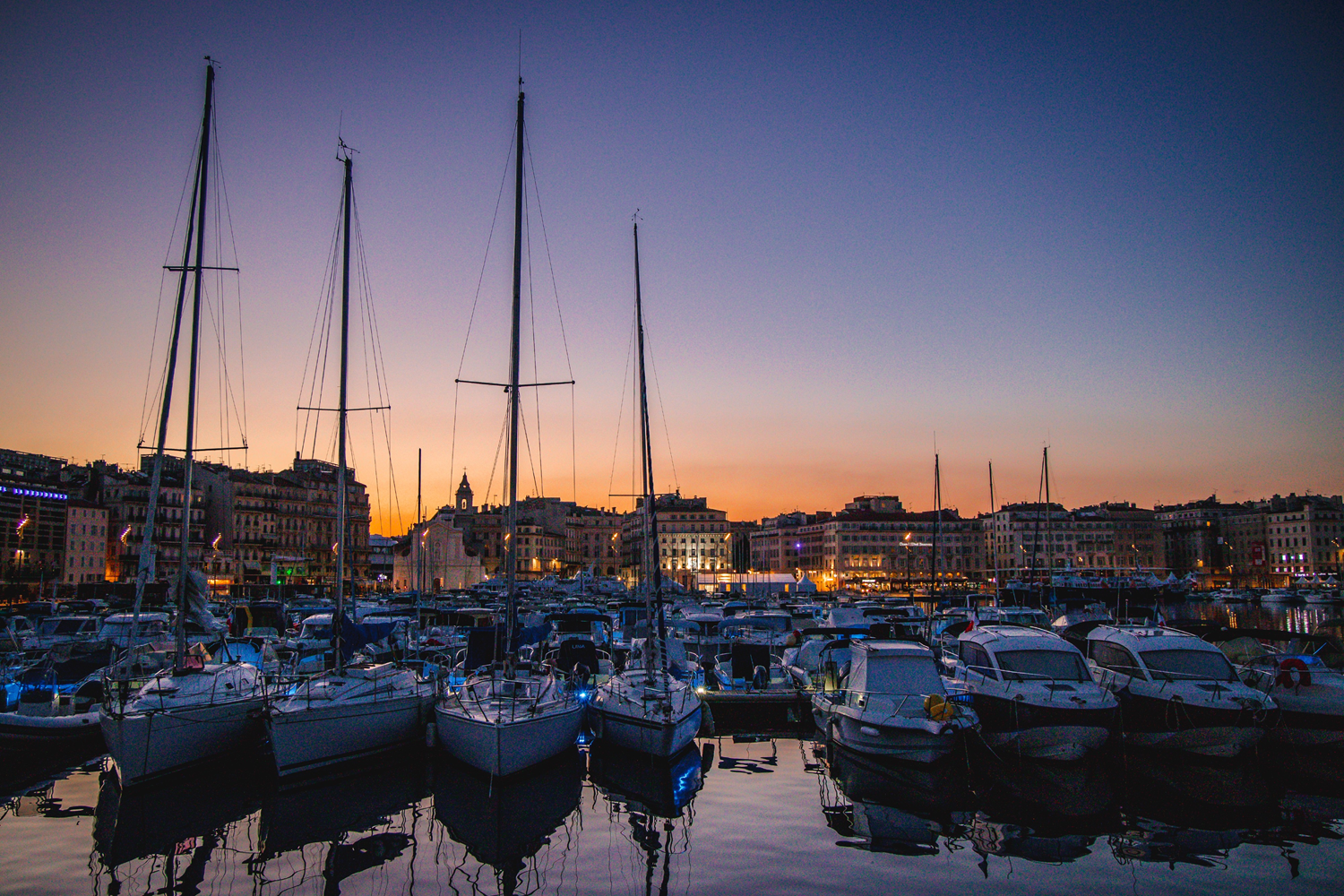 The Old Port has been the historical and geographical heart of the city of Marseille since its founding during Antiquity. Located at the bottom of the Canebière, it is bordered north by the Quai du Port and the town hall, east by the Quai des Belges, and south by the Quai de Rive Neuve. Once the economic center of Marseille largely open to commercial activity in the Mediterranean and with the French colonies, it serves as a marina nowadays. More discreet than Notre-Dame-de-la-Garde, the Saint-Ferréol church (in the background on the edge of the Quai des Belges) was built in the 16th century.