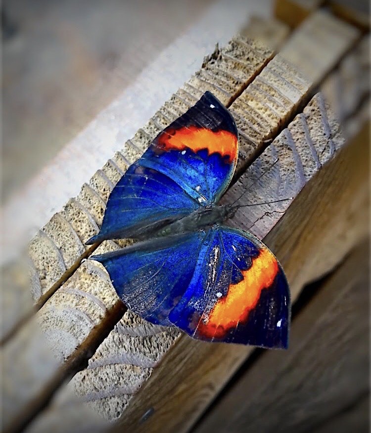 The orange oak leaf is a master of camouflage when it has its wings shut but when it opens them it reveals its stunning blue and orange colours 🦋