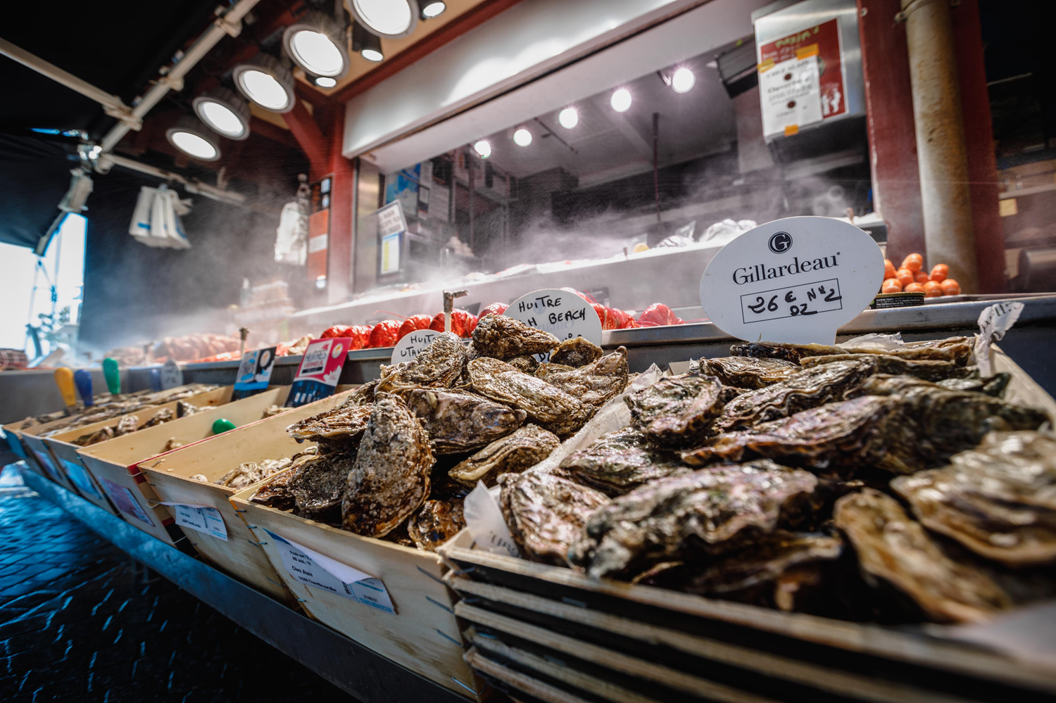 At the Trouville-sur-Mer Fish Market, one can find local oysters from Normandy, such as Utah Beach oysters, but also oysters from the Marennes-Oléron basin, such as the Gillardeau (foreground). The Gillardeau, named after the family of oyster farmers who raise it, was born in 1978. The development of these oysters fed on plankton in deep waters for more than three years requires numerous and precise manipulations, including regular turnings and cleanings. The No. 2 displayed on the label corresponds to a size designating oysters from 3 to 3.8 oz (86 to 110 grams).