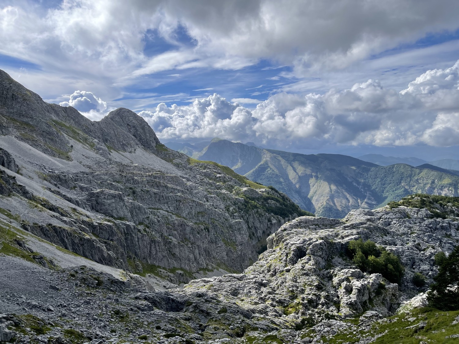 En randonnée dans le Parco Naturale Regionale delle Alpi Apuane, dans la région du Garfagnana au nord de la Toscane. Ces montagnes sont faites de marbre qui est exploité un peu plus à l’Ouest près de Carrare.