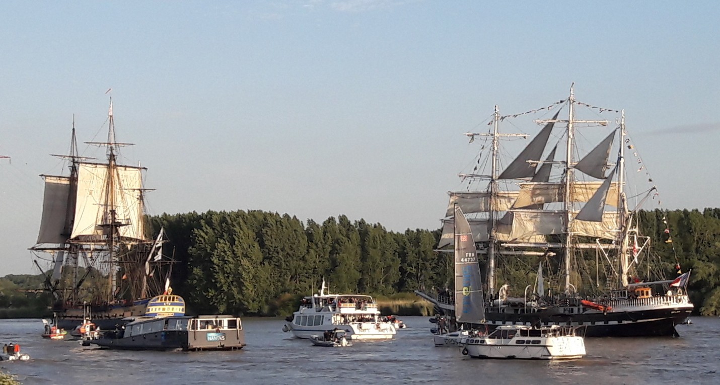 Dans le cadre de Débord de Loire 2019, les navires Hermione et Belem remontent ensemble l'estuaire de la Loire entre Saint-Nazaire et Nantes