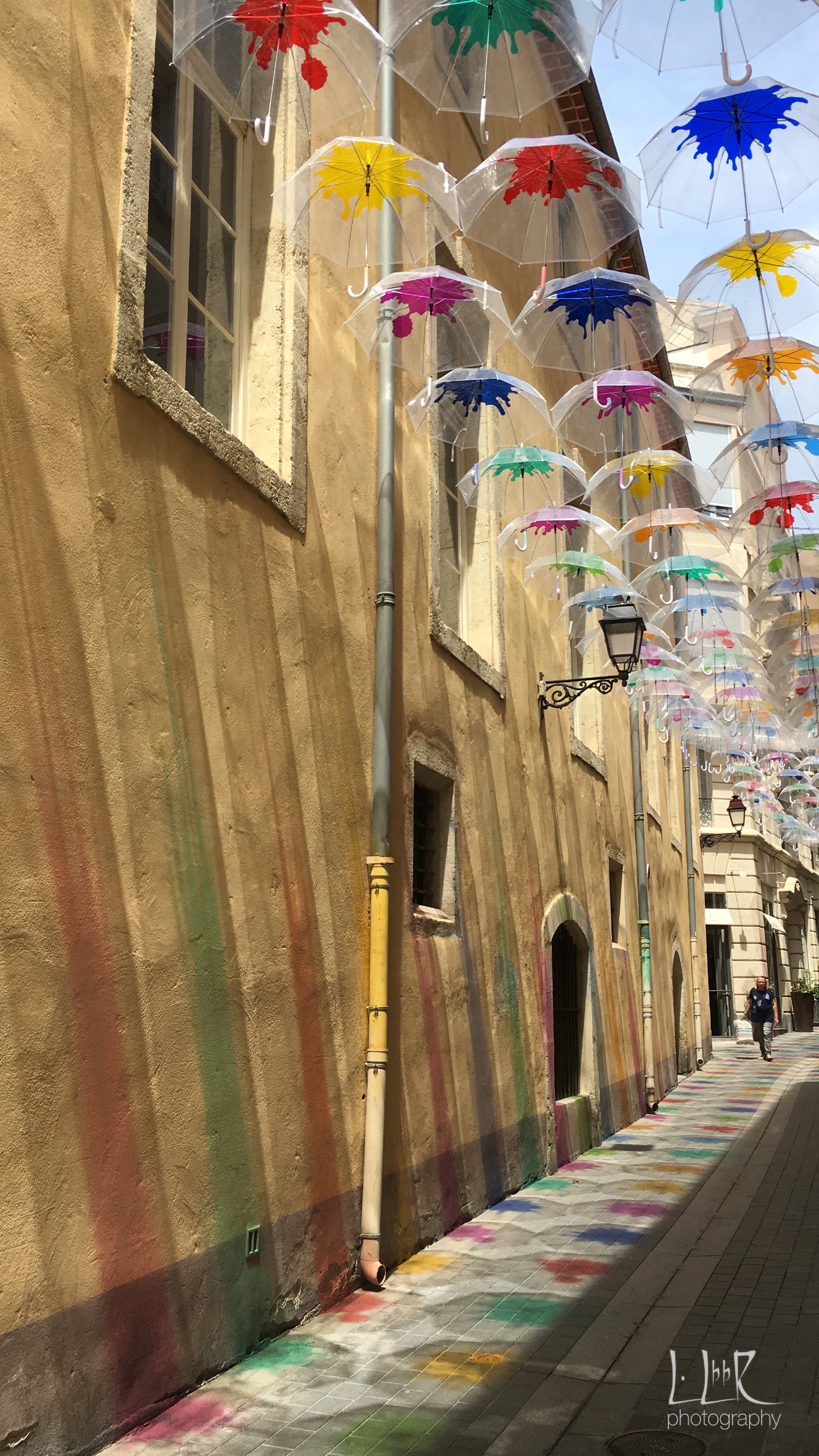 Béziers pare ses rues de parapluies jouants avec la lumière ce qui offre une multitude de couleurs sur les murs et le sol.