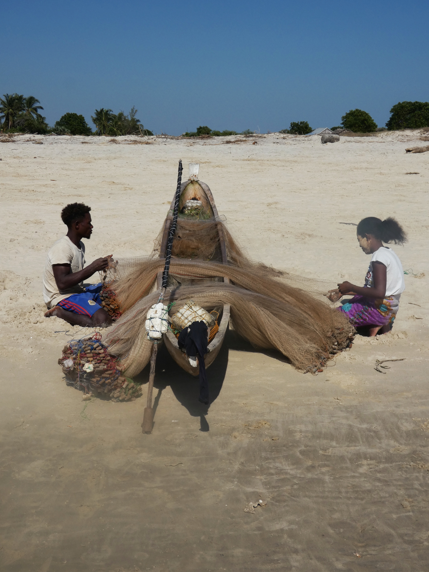 Pareja de pescadores vezo desenredando las artes de pesca tras la faena en las playas de Betania. Madagascar.