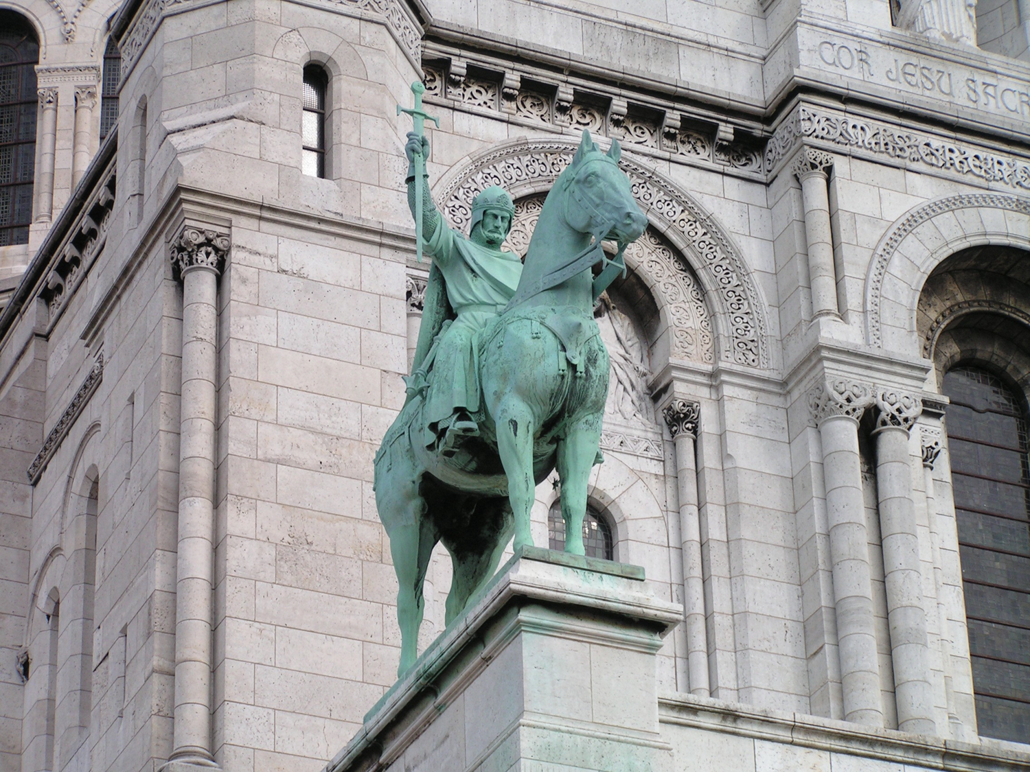 La sculpture de gauche représente Saint-Louis brandissant son épée d'une main et la couronne du Christ de l'autre main.