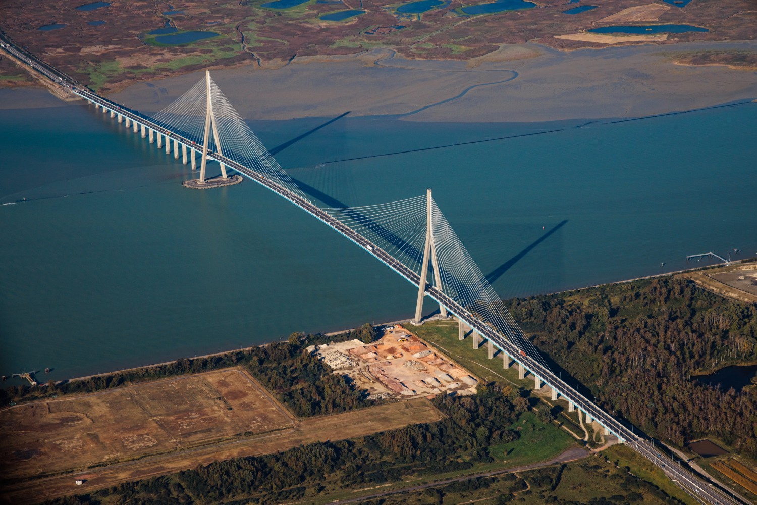 The alluvial grounds made up of mudflats, reedbeds and a sandy and muddy foreshore posed a problem for the construction of the Pont de Normandie between the Seine-Maritime and Calvados departments. Deep foundations were necessary to overcome the layers of sand, peat, gravel, and clay and reach the limestone. Piles 164 ft (50 m) long were installed by drilling under the inverted Y pillars. Geometric monitoring permanently scans the supports of the pylons and the 26 piles of the viaducts, whose ground is regularly leveled.