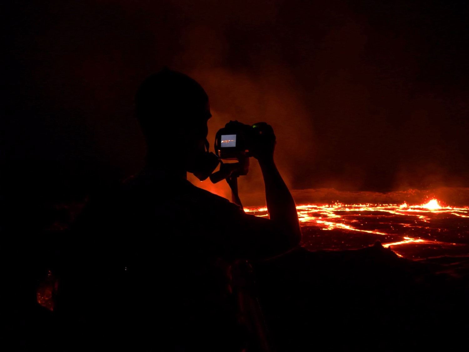 Photographe devant le lac de lave du Dallol avec un masque à gaz