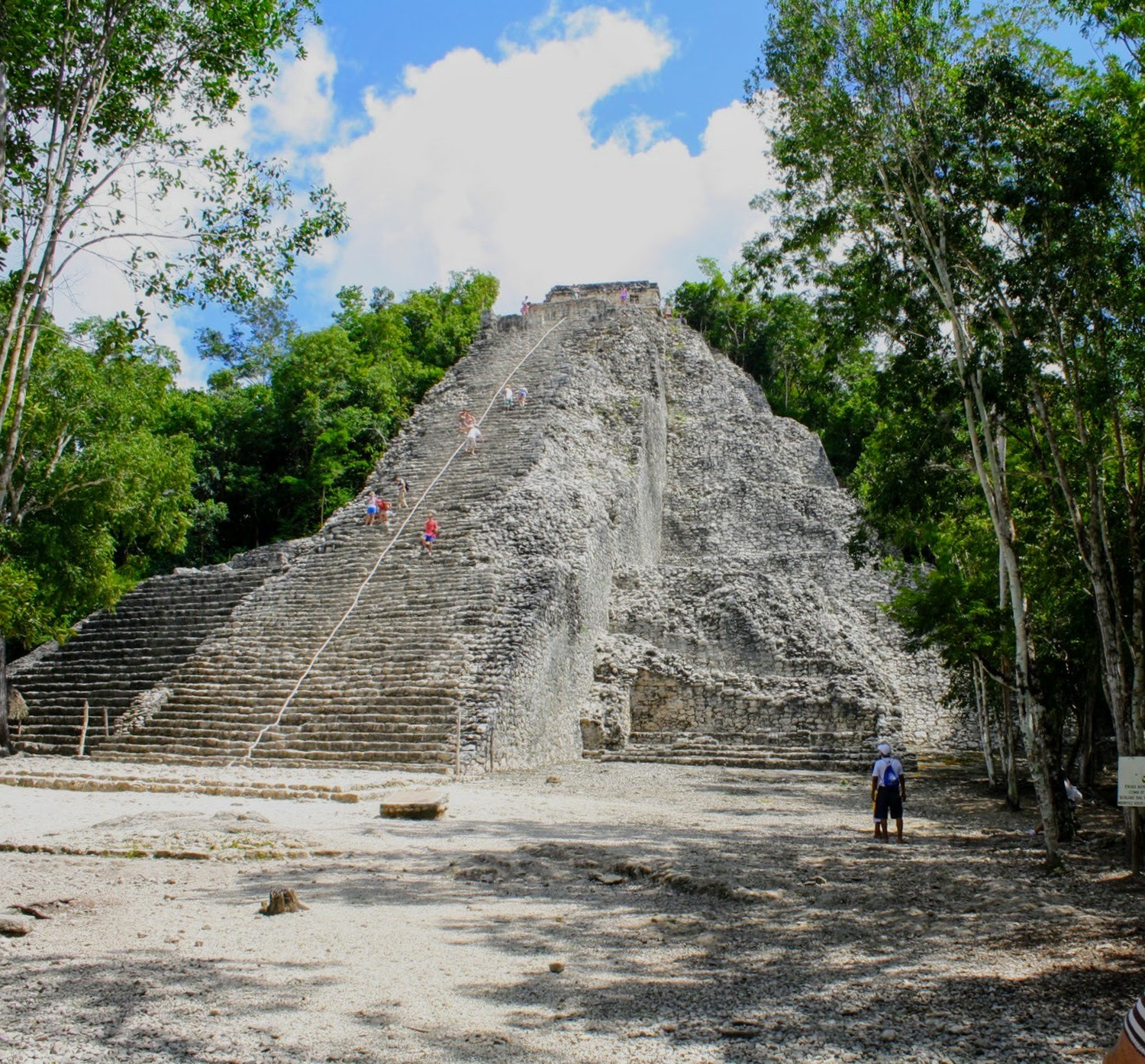 La pirámide de Nohoch Mul no es la construcción más famosa de la cutura maya, pues la palma se la lleva el templo de Chichen-Itzá, pero sí puede presumir de ser la más alta de la Península de Yucatán, en México. Se encuentra en el complejo de las ruinas mayas de Cobá. Tras subir sus 120 escalones no aptos para aquellos que sufran vértigo, nos alzamos 42 metros sobre la selva.