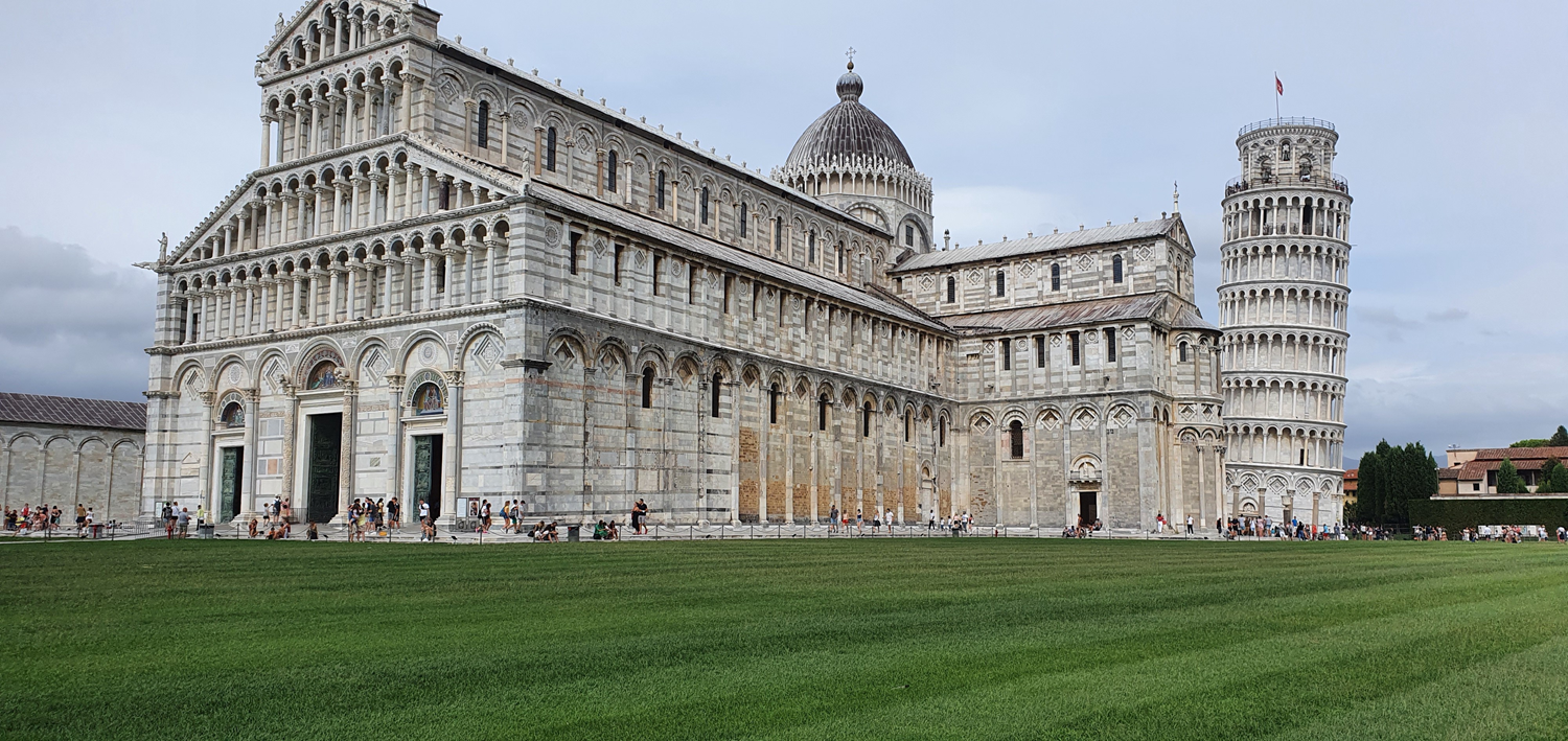 La tour de Pise, en marbre blanc de 56 mètres de haut est le campanile de la cathédrale romane en marbre clair et sombre qui s'élève à ses côtés sur la Piazza dei Miracoli.