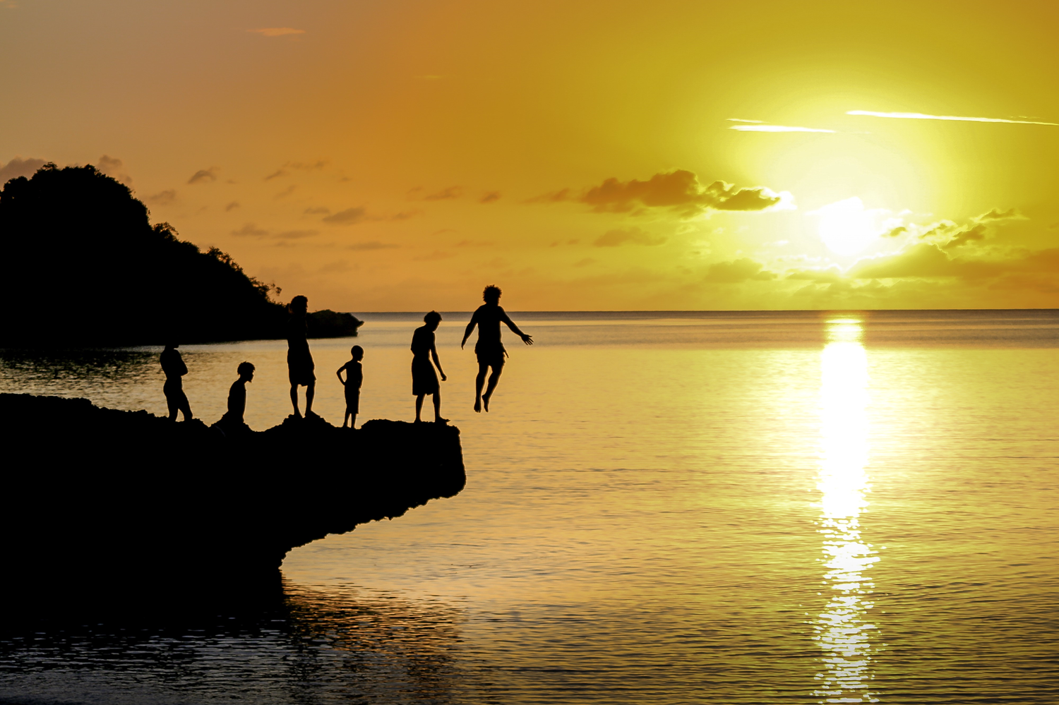 Coucher de soleil somptueux à Peng, Lifou, avec les jeunes de la tribu s'amusant dans les reflets orangés